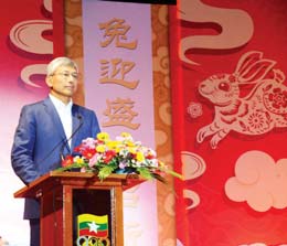 ယင်းနောက် မြန်မာနိုင်ငံဆိုင်ရာ တရုတ်ပြည်သူ့သမ္မတနိုင်ငံ သံအမတ်ကြီးက နှစ်သစ် ဆုတောင်းစကားပြောကြားရာတွင် တရုတ်နှစ်သစ် ကူးပွဲတော်သို့ ယခုကဲ့သို့ နိုင်ငံ့အကြီးအကဲကိုယ်တိုင် တက်ရောက်သည်မှာ ပထမဦးဆုံးအကြိမ်ဖြစ်ပြီး တက်ရောက်ချီးမြှင့်ပေးခဲ့သည့်အတွက် ကျေးဇူးအထူးတင်ရှိပါကြောင်း၊ နှစ်သစ်တွင် တရုတ်နိုင်ငံအနေဖြင့် မြန်မာနိုင်ငံနှင့်အတူ ဆွေမျိုးပေါက်ဖော် သံယောဇဉ်ကို ဆက်လက်လက်ဆင့်ကမ်းပြီး တရုတ်-မြန်မာ အေးအတူပူအမျှ အသိုက်အဝန်း တည်ဆောက်မှုကို စဉ်ဆက်မပြတ်ဖော်ဆောင်ကာ နှစ်နိုင်ငံချစ်ကြည်ရင်းနှီးမှု ရလဒ်များဖြင့် နှစ်နိုင်ငံ ပြည်သူများအတွက် အကျိုးကိုပိုမိုဖော်ဆောင်သွားမည်ဖြစ်ကြောင်း၊ နှစ်နိုင်ငံဆက်ဆံရေးနှင့် ချစ်ကြည်ရင်းနှီးမှုများ ယခုထက် ပိုမိုတိုးတက်ခိုင်မြဲပြီး အဓွန့် ရှည်တည်တံ့ပါစေရန် ဆုမွန်ကောင်းတောင်းပါကြောင်းဖြင့် ပြောကြားသည်။ ဆက်လက်ပြီး မြန်မာနိုင်ငံ တရုတ်ကုန်သည်များ အသင်းချုပ်ဥက္ကဋ္ဌက နှစ်သစ်ဆုတောင်းစကား ပြောကြားသည်။