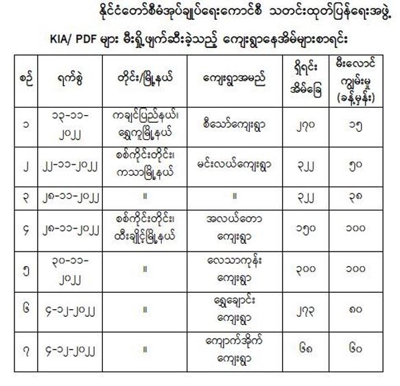 မြေပြင်စစ်ဆေးတွေ့ရှိချက်များအရ ၂၀၂၂ ခုနှစ် နိုဝင်ဘာလနှင့် ဒီဇင်ဘာလအတွင်း NUG/PDF အကြမ်းဖက်သမားများနှင့် KIA သောင်းကျန်းသူပူးပေါင်းအဖွဲ့များ မီးရှို့ဖျက်ဆီးခဲ့သည့် ကျေးရွာပေါင်း ၂၂ ရွာနှင့် မီးလောင်မှု ၂၃ ကြိမ်ရှိခဲ့ပြီး အပြစ်မဲ့ပြည်သူများ၏ နေအိမ် ၁၁၂၂ လုံး မီးလောင်ဆုံးရှုံးခဲ့ကြောင်း သိရှိရပါသည်။