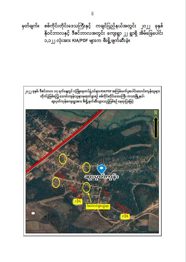အကြမ်းဖက်အဖွဲ့အစည်းအဖြစ်သတ်မှတ်ထားသည့် NUG၊ PDF အဖွဲ့များသည် နိုင်ငံတော်တည်ငြိမ်အေးချမ်းရေးနှင့် တရားဥပဒေစိုးမိုးရေးပျက်ပြားစေရန် ရည်ရွယ်ချက်ဖြင့် စစ်ဘက်ပစ်မှတ်မဟုတ်သည့် အရပ်ဘက်ပစ်မှတ်များအား တိုက်ခိုက်ဖျက်ဆီးလျက်ရှိခြင်း၊ အပြစ်မဲ့ပြည်သူများအား ဒလန်ဟုစွပ်စွဲပြီးအကြောင်းမဲ့ သတ်ဖြတ်ခြင်းများကို ပြုလုပ်လျက်ရှိသည့်အပြင် စစ်ကိုင်းတိုင်းဒေသကြီးနှင့် ကချင်ပြည်နယ်ဆက်စပ်နယ်မြေအတွင်းရှိ ကျေးရွာများအား KIA သောင်းကျန်းသူအဖွဲ့များနှင့်ပူးပေါင်းပြီး မီးရှို့ဖျက်ဆီးမှုများကို ရည်ရွယ်ချက်ရှိရှိ ဆောင်ရွက်လျက်ရှိပါသည်။
