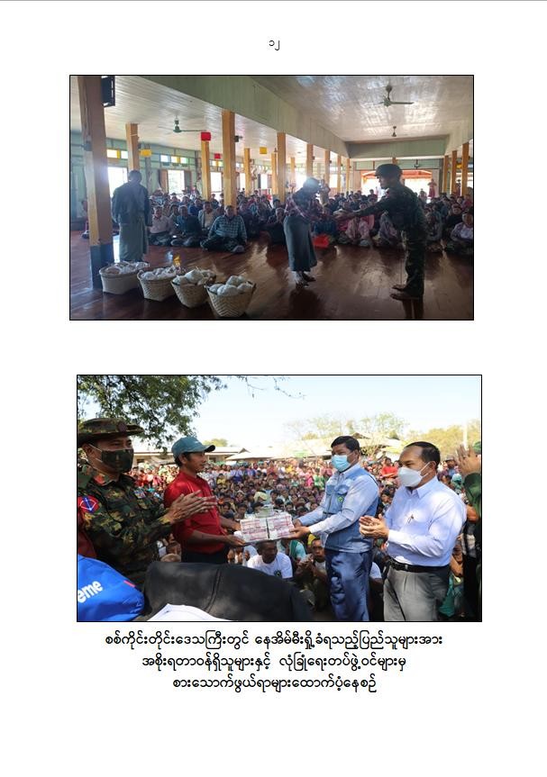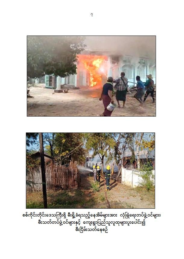 အကြမ်းဖက်သမား NUG၊ PDF၊ KIA ပူးပေါင်းအဖွဲ့များ မီးရှို့ဖျက်ဆီးခဲ့သည့် ကျေးရွာ ၂၂ ရွာမှ ဒုက္ခရောက်ခဲ့ရသည့် ရွာသူ/ရွာသားတစ်ချို့၏ မျက်မြင်ကိုယ်တွေ့ ဖြစ်ရပ်မှန်များနှင့် ရင်ဖွင့်ပြောကြားသံများကိုကြားသိခဲ့ရပြီး၊ လုံခြုံရေးတပ်ဖွဲ့ဝင်များက ရွာသားများနှင့်ပူးပေါင်း၍ မီးငြိမ်းသတ်ပေးခြင်း၊ မီးဘေးသင့်ပြည်သူများအား လုံခြုံရေးစီမံပေးခြင်းနှင့် သက်ဆိုင်ရာတိုင်းဒေသကြီးအစိုးရနှင့် တပ်မတော်မှ ကူညီကယ်ဆယ်ရေးထောက်ပံ့ပေးခြင်းများကို ဆောင်ရွက်ပေးလျက်ရှိပါသည်။