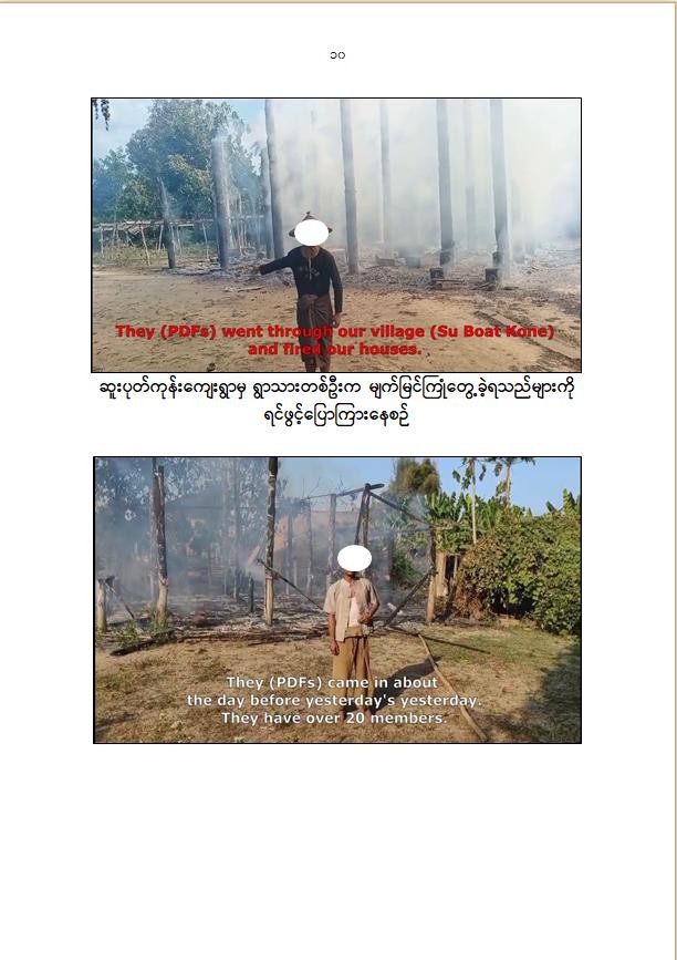 PDF တွေကရွာထဲကနေဖြတ်သွားပြီး ကျွန်တော့်အိမ်ကို မီးရှို့သွားတာပါ။ မနက်အစောကြီးကမီးရှို့သွားတာ။ ကျွန်တော့်အိမ်တင်မဟုတ်ဘူး၊ ဘေးကအိမ်တွေပါ မီးရှို့သွားတာပါ။ PDF တွေ ၂၀/၃၀ လောက်ရှိမယ်။ ကျွန်တော်မျက်စိနဲ့မြင်လိုက်တယ်။ ယူနီဖောင်းတွေနဲ့ပါ။ တချို့ကလည်း အရပ်ဝတ်တွေနဲ့ပါ။ ကျွန်တော့်အိမ်ကိုမီးရှို့သွားတာပါ။ ကလေးတွေတောင်လယ်တောထဲမှာပါဟု ဆူးပုတ်ကုန်းကျေးရွာမှရွာ သားတစ်ဦးကပြောသည်။
