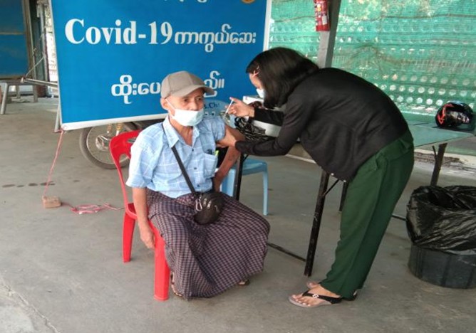 ကိုဗစ်-၁၉ ရောဂါ ကာကွယ်၊ ထိန်းချုပ်၊ ကုသရေးဆောင်ရွက်ရာတွင် ကာကွယ်ဆေးထိုးနှံခြင်းသည် အဓိကအခန်းကဏ္ဍတွင်ပါဝင်သည့် လုပ်ငန်းတစ်ရပ်ဖြစ်သောကြောင့် တိုင်းဒေသကြီးနှင့် ပြည်နယ်အသီးသီးတို့၌ ကာကွယ်ဆေးထိုးနှံခြင်းကို အင်တိုက်အားတိုက် ဆောင်ရွက်လျက်ရှိရာ ယနေ့တွင် ဧရာဝတီတိုင်းဒေသကြီးအတွင်းရှိ မြို့နယ်(၂၆)မြို့နယ်တို့၌ ဒေသခံပြည်သူ ၆၉၂ ဦးနှင့် ပဲခူးတိုင်းဒေသကြီး၊ တောင်ငူမြို့၌ ဒေသခံပြည်သူ ၄၅ ဦးတို့ကို တပ်မတော်မှဆေးအဖွဲ့များက ပြည်သူ့ဆေးရုံများမှ ဆရာဝန်များ၊ သက်ဆိုင်ရာကျန်းမာရေးဝန်ထမ်းများ၊ စေတနာ့ဝန်ထမ်းများနှင့်ပူးပေါင်း၍ ကိုဗစ်-၁၉ရောဂါ ကာကွယ်ဆေးထိုးနှံပေးခြင်းများ ဆောင်ရွက်ပေးသည်။