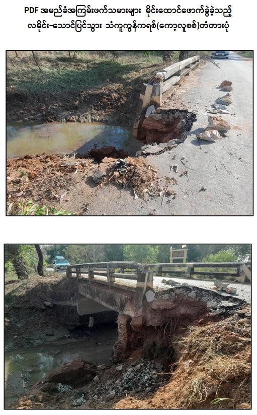 မွန်ပြည်နယ်၊ ရေးခရိုင်၊ လမိုင်းမြို့နယ်၊ လမိုင်းမြို့ - သောင်ပြင်ကျေးရွာသွား ကားလမ်းပေါ်ရှိ ဒေသခံပြည်သူများက ကိုယ်ထူကိုယ်ထဖြင့် တည်ဆောက်ထားသည့် အရှည် ၃၀ ပေ၊ အကျယ် ၁၂ ပေရှိ ကော့လူစစ်သံကူကွန်ကရစ်တံတားအား PDF အမည်ခံအကြမ်းဖက်သမားများက ယနေ့ညနေ ၃ နာရီ ၃၀ မိနစ်ခန့်တွင် ဒေသန္တရလက်လုပ်မိုင်းဖြင့် မိုင်းထောင်ဖောက်ခွဲဖျက်ဆီးခဲ့သည်။