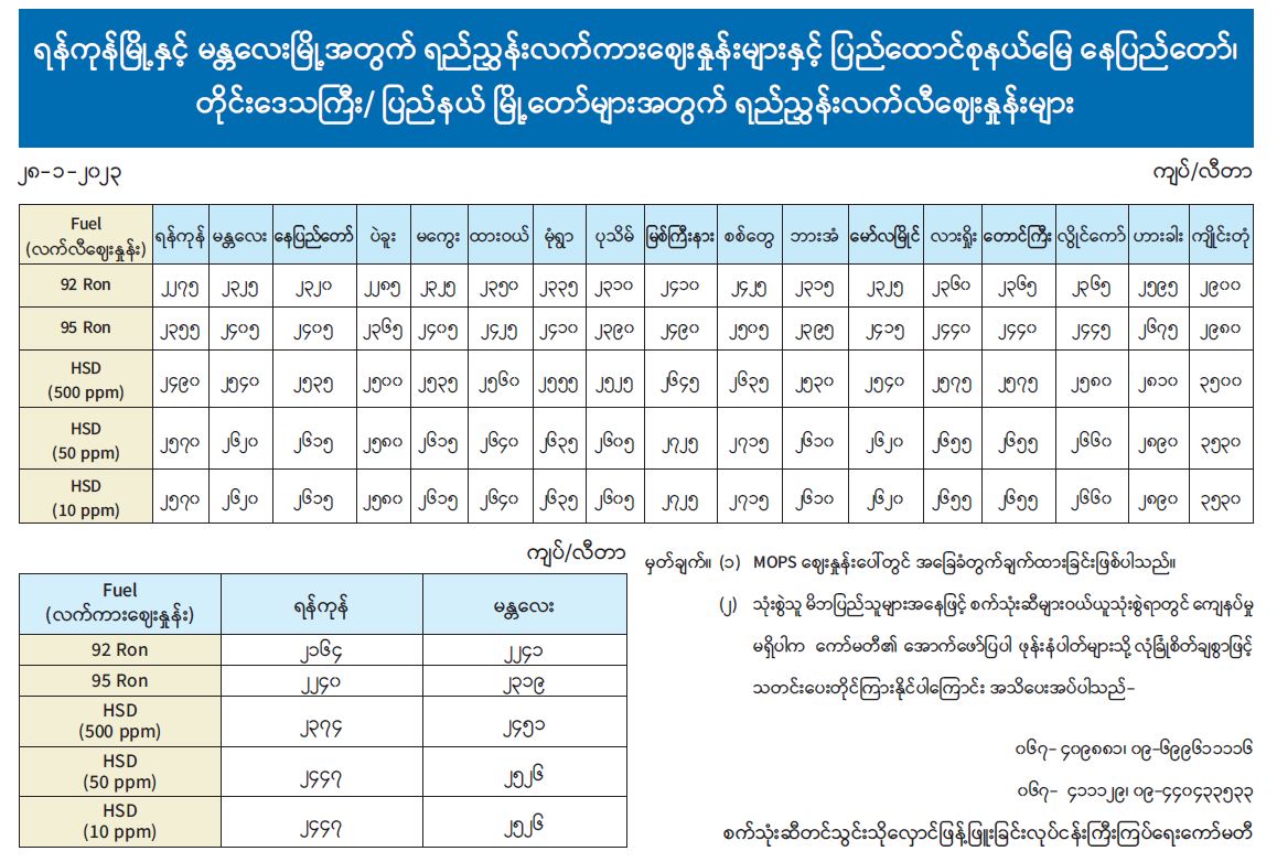 ရန်ကုန်မြို့နှင့် မန္တလေးမြို့အတွက် ရည်ညွှန်းလက်ကားဈေးနှုန်းများနှင့် ပြည်ထောင်စုနယ်မြေ နေပြည်တော်၊ တိုင်းဒေသကြီး/ ပြည်နယ် မြို့တော်များအတွက် ရည်ညွှန်းလက်လီဈေးနှုန်းများ 01/28/2023