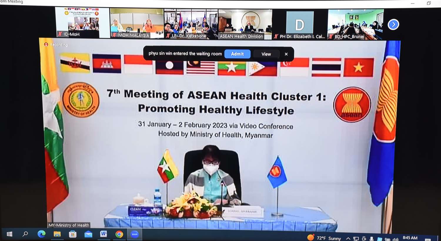 (၇)ကြိမ်မြောက် အာဆီယံကျန်းမာသောလူနေမှုစနစ်မြှင့်တင်ရေး ကျန်းမာရေးဆိုင်ရာအစုအဖွဲ့-၁ အစည်းအဝေး (7th Meeting of ASEAN Health Cluster 1: Promoting Healthy Lifestyle) ဖွင့်ပွဲအခမ်းအနားကို နေပြည်တော်၊ ကျန်းမာရေးဝန်ကြီးဌာန အစည်းအဝေးခန်းမ၌ ယနေ့နံနက် (၈) နာရီခွဲတွင် Hybrid စနစ်ဖြင့် ကျင်းပသည်။