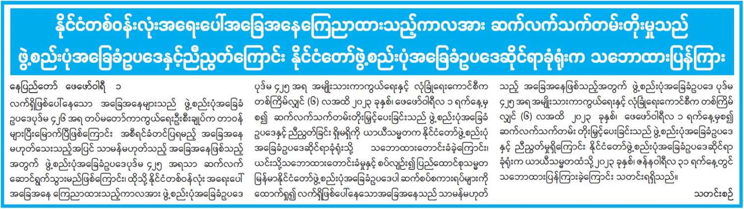 နိုင်ငံတစ်ဝန်းလုံး အရေးပေါ်အခြေအနေကြေညာထားသည့် ကာလအား ဆက်လက်သက်တမ်းတိုးမှုသည် ဖွဲ့စည်းပုံအခြေခံဥပဒေနှင့် ညီညွတ်ကြောင်း နိုင်ငံတော်ဖွဲ့စည်းပုံအခြေခံဥပဒေဆိုင်ရာခုံရုံးက သဘောထားပြန်ကြား 02/02/2023