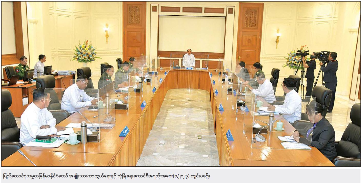 အဆိုပါကာလကဖြစ်ပေါ်ခဲ့သည့် အခြေအနေများအရ ဖွဲ့စည်းပုံအခြေခံဥပဒေနှင့်အညီ ပြဋ္ဌာန်းထား သည့် သက်တမ်းများအလိုက် တပ်မတော်ကာကွယ်ရေးဦးစီးချုပ်အား နိုင်ငံတော်တာဝန်ကို ထမ်းဆောင်ရန် အမျိုးသားကာကွယ်ရေးနှင့် လုံခြုံရေးကောင်စီအစည်းအဝေးသို့ တက်ရောက်လာသူများက သဘောတူ အတည်ပြုခဲ့ပါကြောင်း၊ မိမိတို့အစိုးရအနေဖြင့် ယခုကဲ့သို့ နိုင်ငံတော်တာဝန်ကို ထမ်းဆောင်ခဲ့ရာတွင် ရှေ့လုပ်ငန်းစဉ်(၅)ရပ် ချမှတ်ဆောင်ရွက်ခဲ့ရာ၌ အကောင်အထည်ဖော် ဆောင်ရွက်ခဲ့မှု၊ တိုးတက်ပြောင်းလဲလုပ်ဆောင်မှု အခြေအနေများကို တင်ပြသွားမည်ဖြစ်ပါကြောင်း။