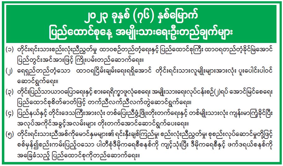 ၂၀၂၃ ခုနှစ် (၇၆) နှစ်မြောက် ပြည်ထောင်စုနေ့ အမျိုးသားရေးဦးတည်ချက်များ