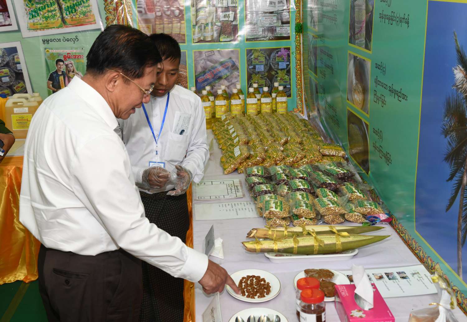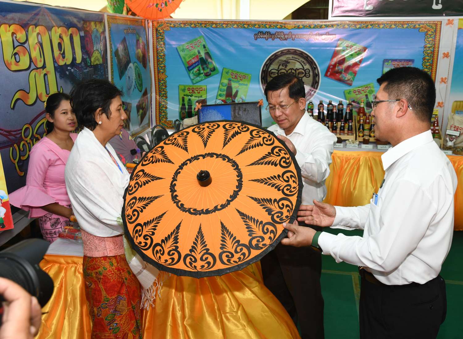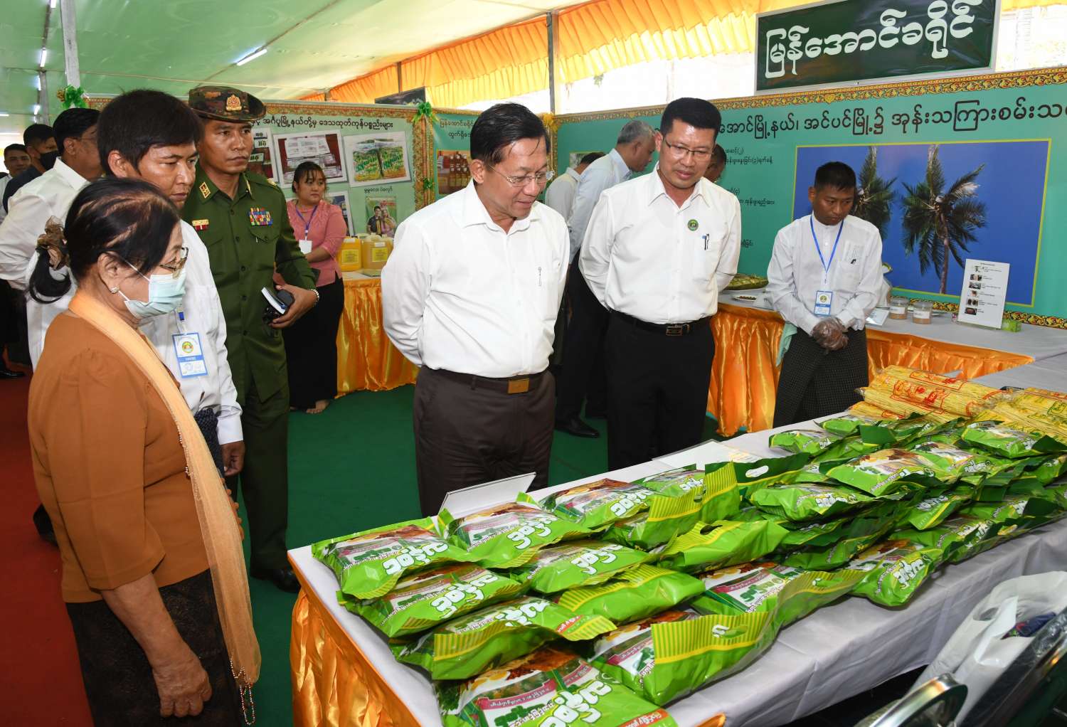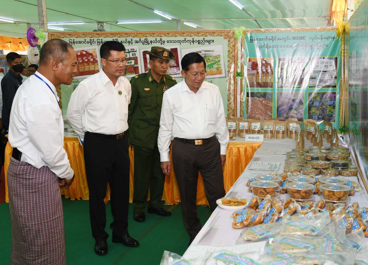 ယင်းနောက် နိုင်ငံတော်စီမံအုပ်ချုပ်ရေးကောင်စီဥက္ကဋ္ဌ နိုင်ငံတော်ဝန်ကြီးချုပ်သည် ခင်းကျင်းပြသထားသည့် ရေထွက်ကုန်ပစ္စည်းများ၊ စားသောက်ကုန်၊ လူသုံးကုန်၊ စက်မှုလက်မှုထုတ်ကုန်၊ ရိုးရာလက်မှု ထုတ်ကုန်များ၊ အဝတ်အထည်များ စသည့်ထုတ်ကုန်ပစ္စည်းများ ခင်းကျင်းပြသထားရှိမှုများကို ပြကွက်တစ်ခုချင်းစီအလိုက် စိတ်ဝင်တစားဖြင့် လေ့လာခဲ့ပြီး ဈေးကွက်ရရှိမှုအခြေအနေများကို မေးမြန်းဆွေးနွေးရာ လုပ်ငန်းအလိုက် စီးပွားရေးလုပ်ငန်းရှင်များက လိုက်လံရှင်းလင်းတင်ပြခဲ့ကြကြောင်း သတင်းရရှိသည်။