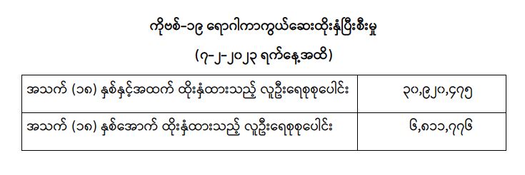 COVID-19 ရောဂါ ကာကွယ်ထိန်းချုပ်ရေးအတွက် တိုင်းဒေသကြီး/ပြည်နယ်များတွင် COVID -19 ရောဂါကာကွယ်ဆေးကို ဦးတည်အုပ်စုများသတ်မှတ်၍ ထိုးနှံပေးလျက်ရှိရာ (၇-၂-၂၀၂၃) ရက်နေ့အထိ အသက် (၁၈) နှစ်နှင့်အထက် လူဦးရေစုစုပေါင်း (30,920,475) ဦးနှင့် အသက် (၁၈) နှစ်အောက် လူဦးရေစုစုပေါင်း (6,811,776) ဦးတို့အား ထိုးနှံထားရှိပြီး ဖြစ်ပါသည်။