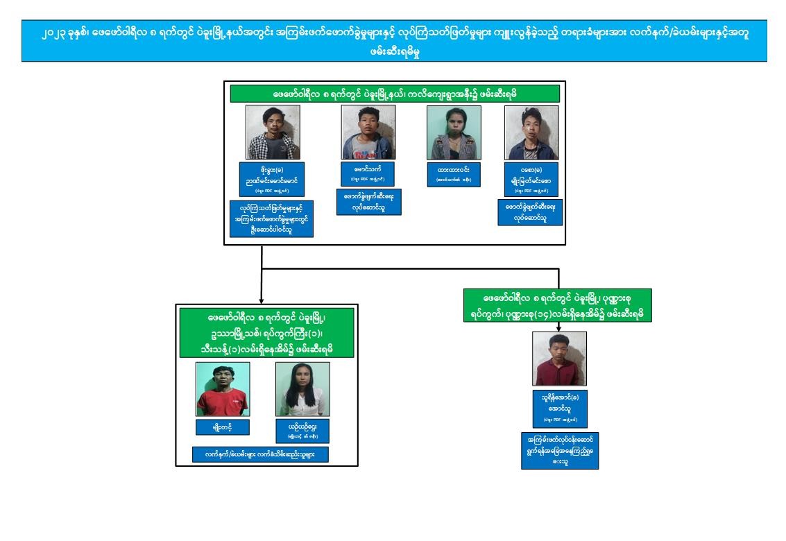 အဆိုပါဖြစ်စဉ်နှင့်ပတ်သက်၍ တရားခံများဖမ်းဆီးရမိရေး လုံခြုံရေးတပ်ဖွဲ့ဝင်များ၏ အစဉ်တစိုက်ကြိုးပမ်းဆောင်ရွက်မှုနှင့် အကြမ်းဖက်မှုကိုမလိုလားသည့် ပြည်သူများ၏ သတင်းပေးပို့ချက်အရ ဖေဖော်ဝါရီလ ၈ ရက် ညနေပိုင်းတွင် ပဲခူးမြို့နယ်၊ ကလိကျေးရွာအနီး၌ ပဲခူးမြို့နယ်အတွင်း လက်လုပ်မိုင်းများဖောက်ခွဲခဲ့သည့် တရားခံ ဖိုးခွား(ခ)ဉာဏ်မင်းမောင်မောင် (၂၀)နှစ်၊ မောင်သက်(၂၃)နှစ်နှင့် ၎င်း၏ဇနီးထားထားဝင်း(၂၃)နှစ်၊ ငစော(ခ)မျိုးမြတ်မင်းစော(၁၉)နှစ်တို့ ၄ ဦးအား ဖမ်းဆီးရမိခဲ့သည်။