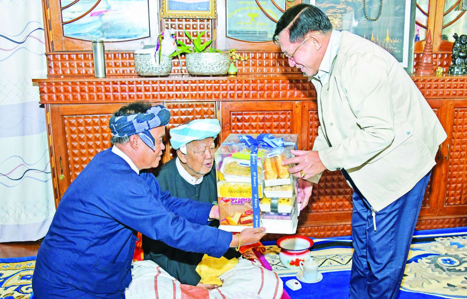 ယင်းနောက် နိုင်ငံတော်စီမံအုပ်ချုပ်ရေးကောင်စီဥက္ကဋ္ဌ နိုင်ငံတော်ဝန်ကြီးချုပ်က ပအိုဝ်းအမျိုးသားအဖွဲ့ချုပ်(PNO)နာယက ဦးအောင်ခမ်းထီအား စားသောက်ဖွယ်ရာများနှင့် လက်ဆောင်ပစ္စည်းများပေးအပ်ခဲ့ရာ ဒေသထွက်လက်ဆောင်ပစ္စည်းများနှင့် ဓမ္မလက်ဆောင်များ ပြန်လည်ပေးအပ်သည်။