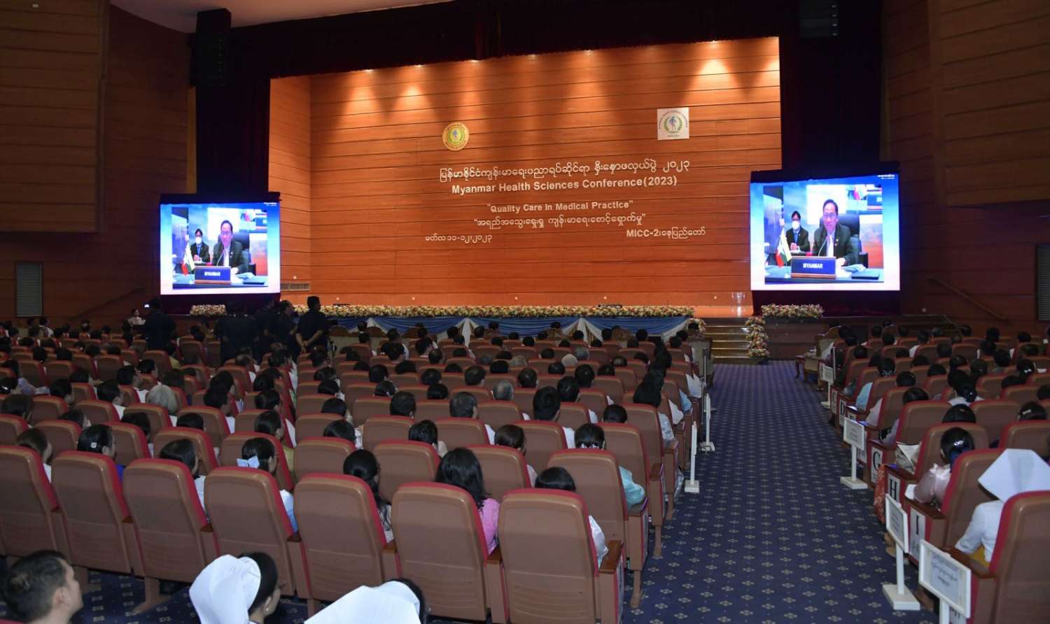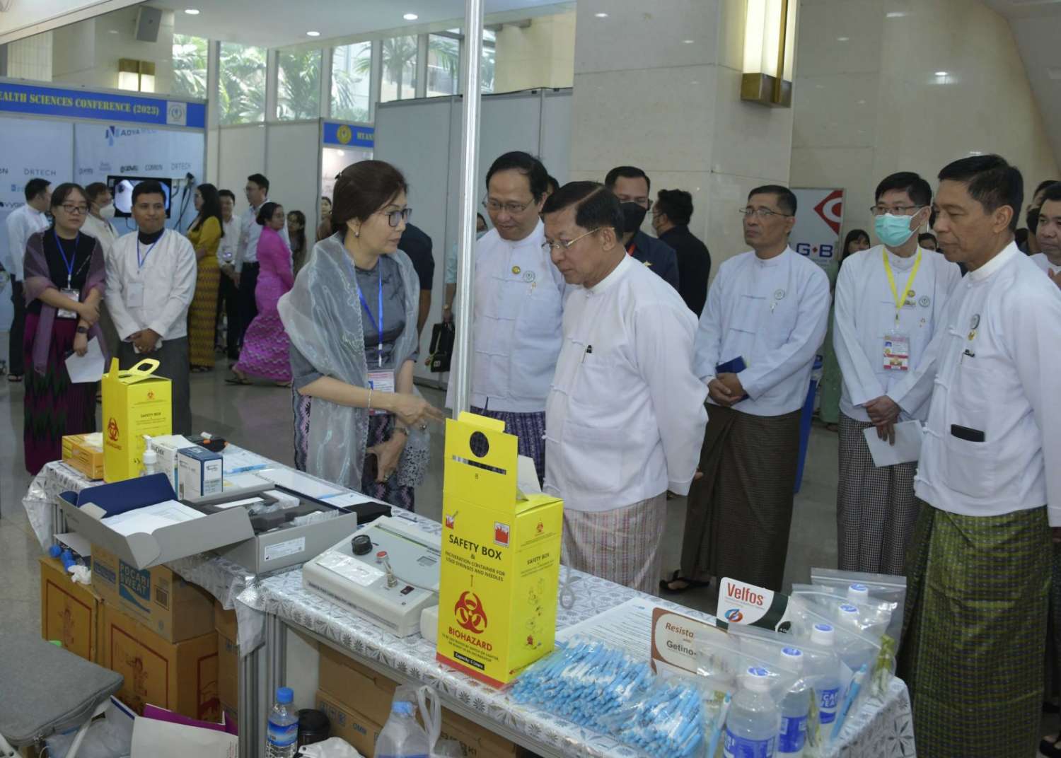 ဦးစွာ နိုင်ငံတော်စီမံအုပ်ချုပ်ရေးကောင်စီ ဒုတိယဥက္ကဋ္ဌ ဒုတိယဝန်ကြီးချုပ်၊ ကျန်းမာရေးဝန်ကြီးဌာန ပြည်ထောင်စုဝန်ကြီး၊ ဆေးဝန်ထမ်းညွှန်ကြားရေးမှူး၊ မြန်မာနိုင်ငံဆေးကောင်စီ ဥက္ကဋ္ဌ၊ မြန်မာနိုင်ငံ သွားနှင့်ခံတွင်းဆိုင်ရာဆေးကောင်စီဥက္ကဋ္ဌ၊ မြန်မာနိုင်ငံသူနာပြုနှင့် သားဖွားကောင်စီဥက္ကဋ္ဌနှင့် မြန်မာနိုင်ငံဆေးပညာရှင်အဖွဲ့ ဒုတိယဥက္ကဋ္ဌတို့က မြန်မာနိုင်ငံကျန်းမာရေးပညာရပ်ဆိုင်ရာ နှီးနှောဖလှယ်ပွဲ (၂၀၂၃) ဖွင့်ပွဲအထိမ်းအမှတ်မုခ်ဦးကို ဖဲကြိုးဖြတ်ဖွင့်လှစ်ပေးကြသည်။