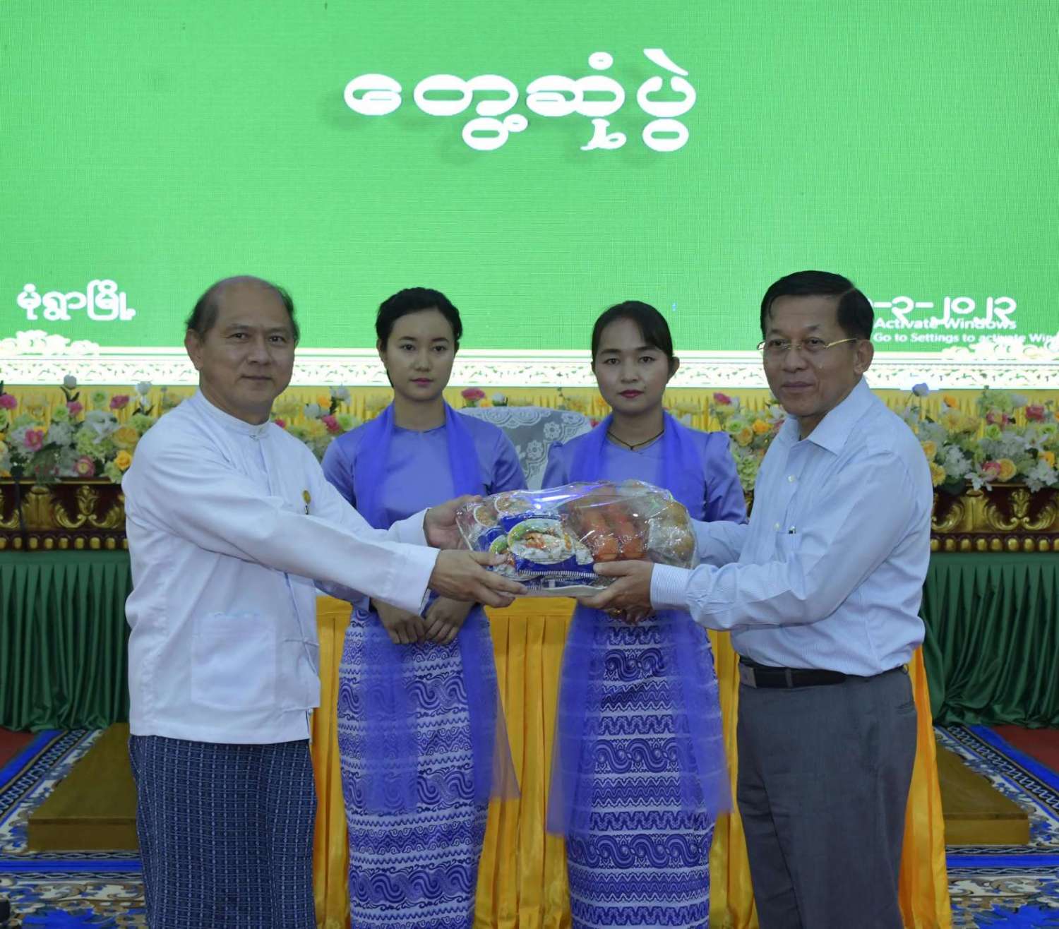 ထို့နောက် နိုင်ငံတော်စီမံအုပ်ချုပ်ရေးကောင်စီဥက္ကဋ္ဌ နိုင်ငံတော်ဝန်ကြီးချုပ်က တိုင်းဒေသကြီး၊ ခရိုင်၊ မြို့နယ်အဆင့် ဌာနဆိုင်ရာဝန်ထမ်းများအတွက် စားသောက်ဖွယ်ရာပစ္စည်းများကိုပေးအပ်ရာ တိုင်းဒေသကြီးအဆင့် ဌာနဆိုင်ရာများကိုယ်စား တိုင်းဒေသကြီးကျန်းမာရေးဦးစီးဌာနမှူး ဒေါက်တာဝင်းနိုင်၊ ခရိုင်အဆင့်ဌာနဆိုင်ရာ များကိုယ်စား မုံရွာခရိုင်အထွေထွေအုပ်ချုပ်ရေးဦးစီးဌာနမှ ခရိုင်အုပ်ချုပ်ရေးမှူး ဦးဇော်တင်မိုး၊ မြို့နယ်အဆင့်ဌာနဆိုင်ရာများကိုယ်စား မုံရွာမြို့နယ်အထွေထွေအုပ် ချုပ်ရေးဦးစီးဌာနမှ မြို့နယ်အုပ်ချုပ်ရေးမှူး ဦးအောင်ဆန်းဝင်းတို့က အသီးသီးလက်ခံရယူကြသည်။