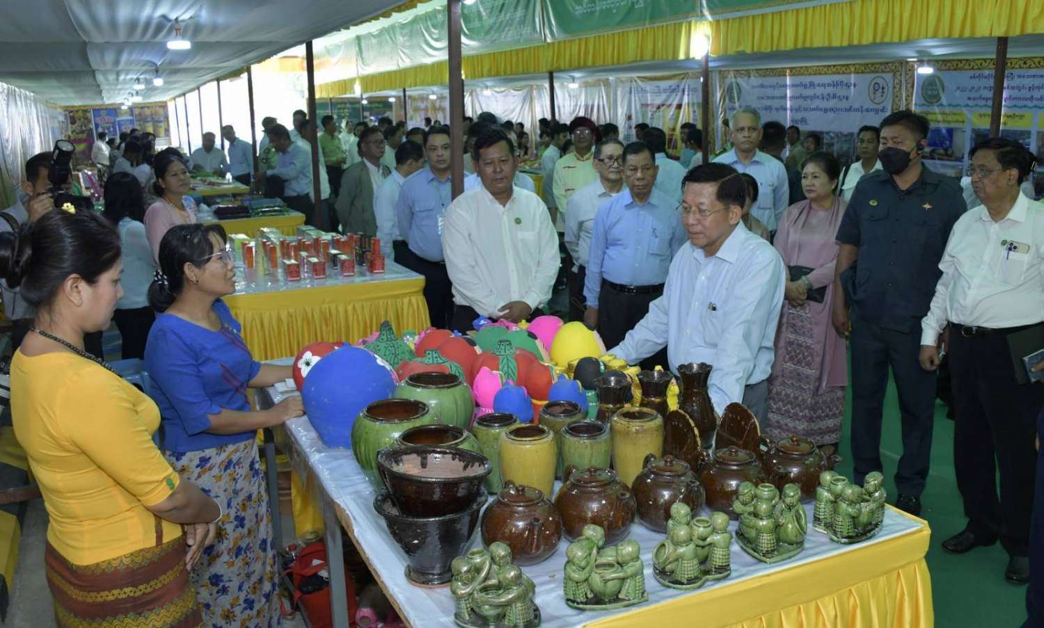 ထို့နောက် နိုင်ငံတော်စီမံအုပ်ချုပ်ရေးကောင်စီဥက္ကဋ္ဌ နိုင်ငံတော်ဝန်ကြီးချုပ်သည် ခင်းကျင်းပြသထားသည့် သယံဇာတတွင်းထွက်ထုတ်ကုန်များ၊ စားသောက်ကုန်၊ လူသုံးကုန်၊ စက်မှုလက်မှုထုတ်ကုန်၊ ရိုးရာလက်မှု ထုတ်ကုန်များ၊ အဝတ်အထည်များ၊ တိုင်းရင်းဆေးများ စသည့် ထုတ်ကုန်ပစ္စည်းများခင်းကျင်းပြသထားရှိမှုများကို ပြကွက်တစ်ခုချင်းစီအလိုက် စိတ်ဝင်တစားဖြင့်လေ့လာခဲ့ပြီး ဈေးကွက်ရရှိမှုအခြေအနေများကို မေးမြန်းဆွေးနွေးရာ လုပ်ငန်းအလိုက်စီးပွားရေးလုပ်ငန်းရှင်များက လိုက်လံရှင်းလင်းတင်ပြခဲ့ကြကြောင်း သတင်းရရှိသည်။