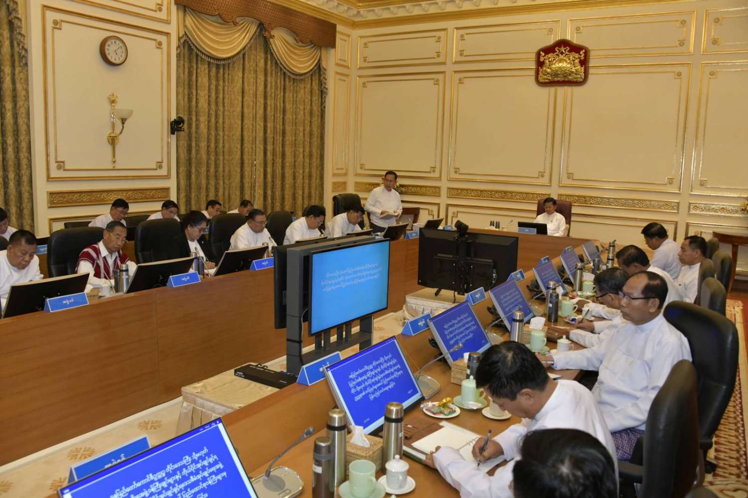 နိုင်ငံတော်စီမံအုပ်ချုပ်ရေးကောင်စီဥက္ကဋ္ဌ နိုင်ငံတော်ဝန်ကြီးချုပ် ဗိုလ်ချုပ်မှူးကြီး မင်းအောင်လှိုင် ကောင်စီအဖွဲ့ဝင်များ၊ ပြည်ထောင်စုဝန်ကြီးများ၊ တိုင်းဒေသကြီးနှင့်ပြည်နယ်ဝန်ကြီးချုပ်များ၊ ကိုယ်ပိုင်အုပ်ချုပ်ခွင့်ရတိုင်း၊ ဒေသစီမံအုပ်ချုပ်ရေးအဖွဲ့ဥက္ကဋ္ဌများနှင့် တွေ့ဆုံညှိနှိုင်းအစည်းအဝေးကျင်းပ