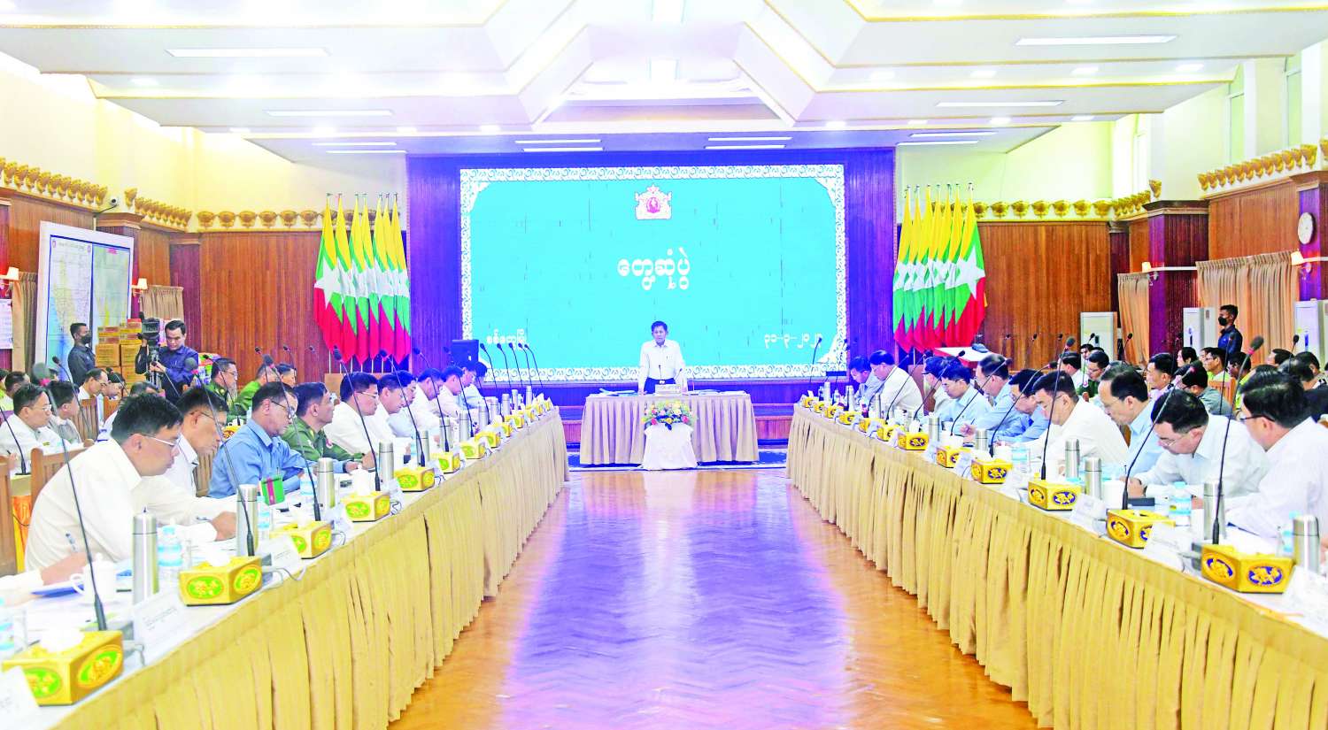 နိုင်ငံတော်စီမံအုပ်ချုပ်ရေးကောင်စီအနေဖြင့် နိုင်ငံတော်ဘက်စုံဖွံ့ဖြိုးတိုးတက်ရေးအတွက် ရှေ့လုပ်ငန်းစဉ်များ၊ ဦးတည်ချက်များချမှတ်၍ ဆောင်ရွက်လျက်ရှိကြောင်း၊ အဆိုပါလုပ်ငန်းစဉ်များ၊ ဦးတည်ချက်များကို အစိုးရဌာနများက အကောင်အထည်ဖော်ဆောင်ရွက်ရခြင်းဖြစ်ကြောင်း၊ လူထုအကျိုးပြုအောင် ဆောင်ရွက်နိုင်မည်၊ တိုင်းပြည်အတွက် အကျိုးပြုအောင်ဆောင်ရွက်နိုင်မည်ဆိုပါက လုပ်ငန်းများအောင်မြင်မည်ဖြစ်ကြောင်း၊ ထို့ကြောင့် လုပ်ငန်းများအောင်မြင်စေရန်အတွက် မျှော်မှန်းဆောင်ရွက်ကြစေလိုကြောင်း။