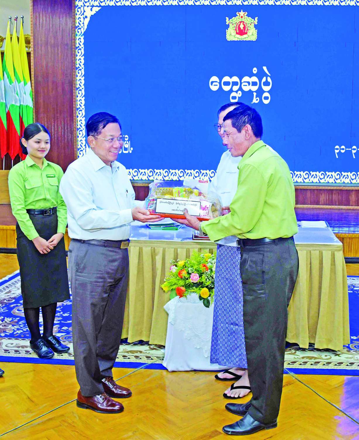 ယင်းနောက် နိုင်ငံတော်စီမံအုပ်ချုပ်ရေးကောင်စီဥက္ကဋ္ဌ နိုင်ငံတော်ဝန်ကြီးချုပ်က ရခိုင်ပြည်နယ်အစိုးရအဖွဲ့နှင့် ပြည်နယ်အဆင့်ဌာန ဆိုင်ရာဝန်ထမ်းများအတွက် စားသောက်ဖွယ်ရာများကို ထောက်ပံ့ပေးအပ်ရာ စစ်တွေတက္ကသိုလ်ဒုတိယပါမောက္ခချုပ် ဒေါက်တာဇော်ထွန်းနှင့် ပြည်နယ်အထွေထွေအုပ်ချုပ်ရေးဦးစီးဌာန ညွှန်ကြားရေးမှူး ဦးကျော်ဝင်းဦးတို့က လက်ခံရယူကြသည်။
