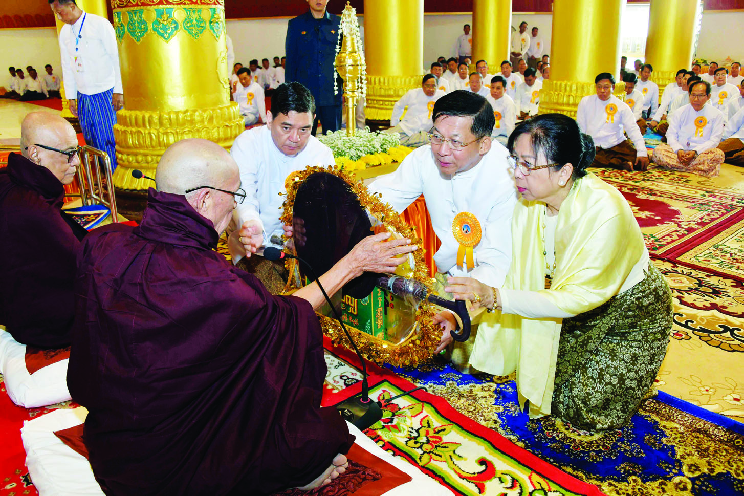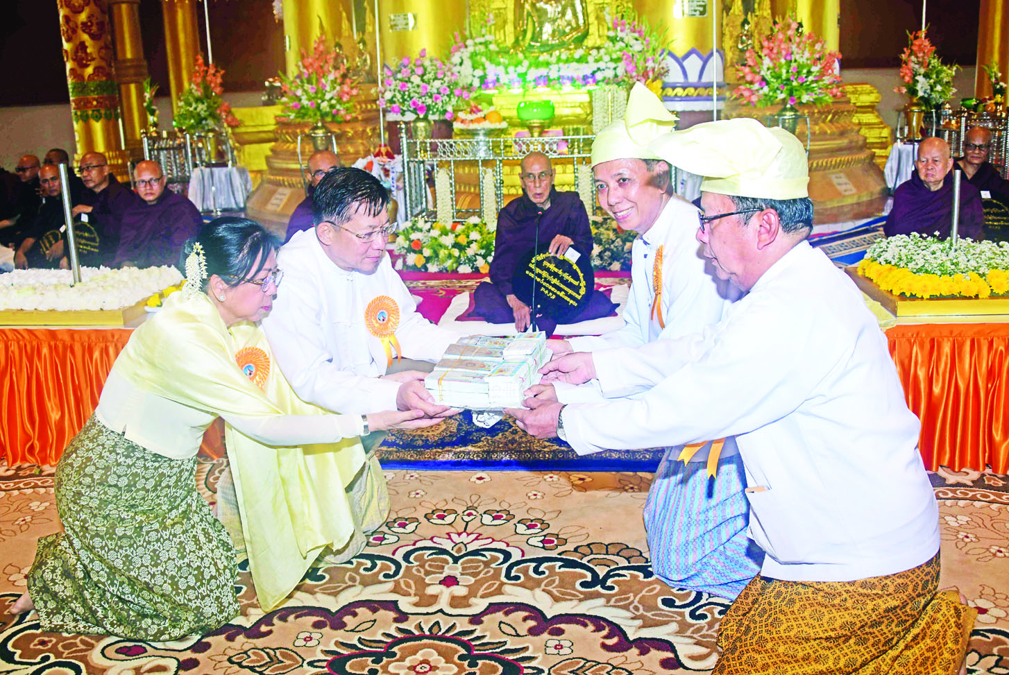 ယင်းနောက် နိုင်ငံတော်စီမံအုပ်ချုပ်ရေးကောင်စီဥက္ကဋ္ဌ နိုင်ငံတော်ဝန်ကြီးချုပ်နှင့် ဇနီးတို့က သဗ္ဗညုဘုရားရှင်အား ရည်မှန်း၍ ရတနာစိန်ဖူးတော်၊ ငှက်မြတ်နားတော်တို့ကို သံဃာတော်များထံသာဟတ္ထိက ဒါနမြောက်ဆက်ကပ်ပူဇော်ပြီး ဆရာတော်ကြီးများအား လှူဖွယ်ပစ္စည်းများ ဆက်ကပ်လှူဒါန်းကြသည်။ ဆက်လက်ပြီး ကောင်စီတွဲဖက်အတွင်းရေးမှူး၊ ကောင်စီဝင်များ၊ ပြည်ထောင်စုဝန်ကြီးများနှင့် အခမ်းအနားတက်ရောက်လာကြသူများက လှူဖွယ်ပစ္စည်းများအား သံဃာတော်အရှင်သူမြတ်များထံ ဆက်ကပ်လှူဒါန်းကြသည်။