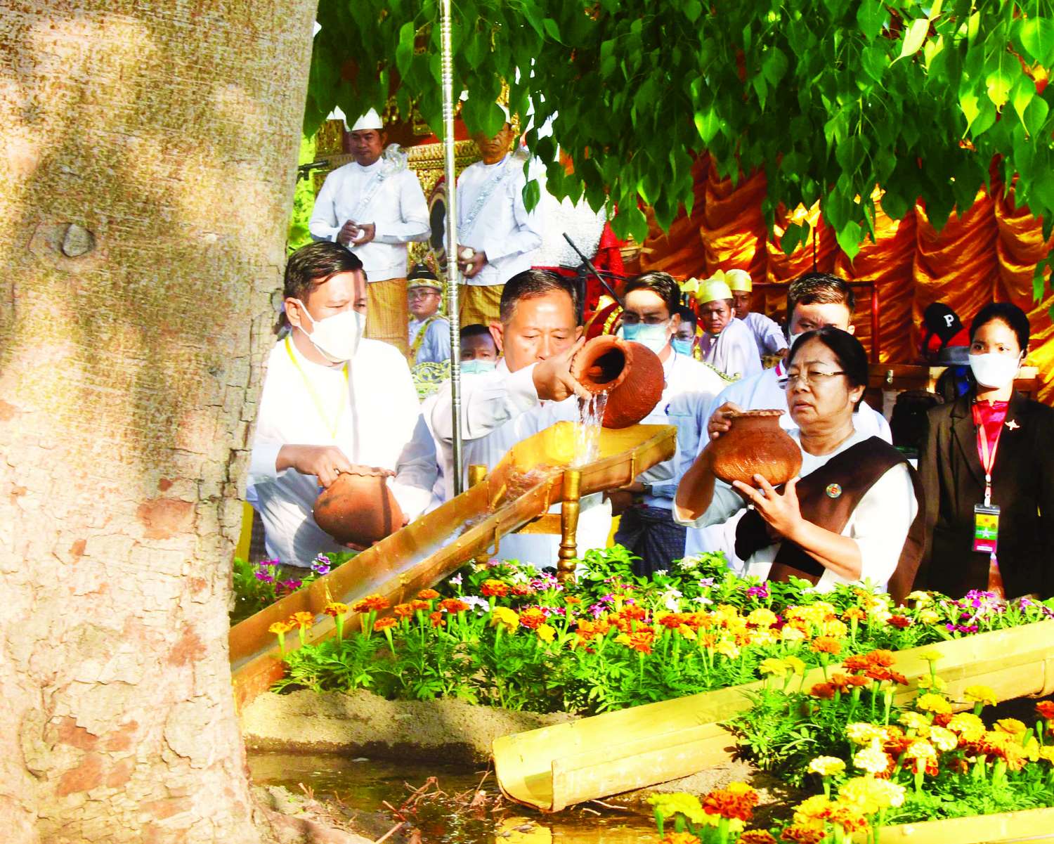 ဦးစွာ နိုင်ငံတော်စီမံအုပ်ချုပ်ရေးကောင်စီဥက္ကဋ္ဌ နိုင်ငံတော်ဝန်ကြီးချုပ်နှင့်ဇနီး၊ ကောင်စီအဖွဲ့ဝင်များနှင့် ဇနီးများ၊ အခမ်းအနားတက်ရောက်လာကြသူများသည် ဥပ္ပါတသန္တိ စေတီတော်မြတ်ကြီး ပရိဝုဏ်တော်အတွင်းရှိ မဟာဗောဓိညောင်ပင်များအား ညောင်ရေသွန်းလောင်းပူဇော်ရန် နေရာယူကြရာ အခမ်းအနားမှူးက မဟာဗောဓိရုက္ခသိဉ္စန ပူဇာ ဂါထာတော်ကို ရွတ်ဖတ်ပူဇော်၍ သာဓုသုံးကြိမ်ခေါ်ဆိုပြီးသည့်အခါ သတ်မှတ်ထားသည့် နေရာများအလိုက် မဟာဗောဓိ ညောင်ပင်တော်များအား ညောင်ရေသွန်းလောင်းပူဇော်ပြီး အမွှေးနံ့သာရည်များ ပက်ဖျန်းပူဇော်ကြကာ မဟာဗောဓိညောင်ပင်များအား လက်ယာရစ် လှည့်လည်ပူဇော်ကြသည်။