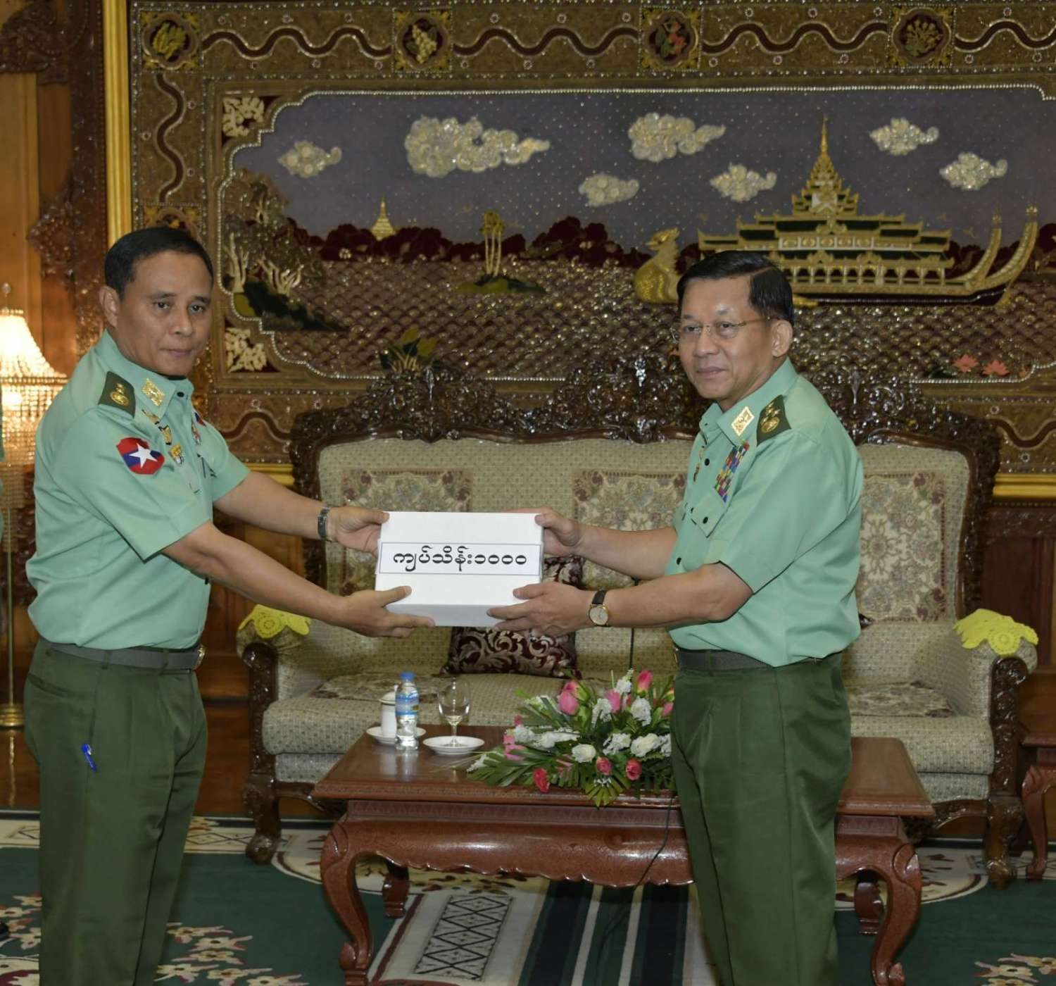 ထို့နောက် မုန်တိုင်းဒဏ်သင့်ခဲ့ရသည့်ဒေသများ၌ ကူညီကယ်ဆယ်ရေးနှင့် ပြန်လည်ထူထောင်ရေးလုပ်ငန်းများ ဆောင်ရွက်ရာတွင် အသုံးပြုနိုင်ရေး စေတနာရှင်၊ အလှူ ရှင်များက အလှူငွေများကို ပေးအပ်လှူဒါန်းကြရာ တပ်မတော်(ကြည်း၊ ရေ၊ လေ) အရာရှိ၊ စစ်သည်၊ မိသားစုများကိုယ်စား စစ်ရေးချုပ် ဒုတိယဗိုလ်ချုပ်ကြီး စိုးမင်းဦးက အလှူငွေကျပ် သိန်း ၁၀၀၀၀ ကို ပေးအပ်လှူဒါန်းရာ နိုင်ငံတော်စီမံအုပ်ချုပ်ရေးကောင်စီဥက္ကဋ္ဌ နိုင်ငံတော်ဝန်ကြီးချုပ်က လက်ခံရယူသည်။