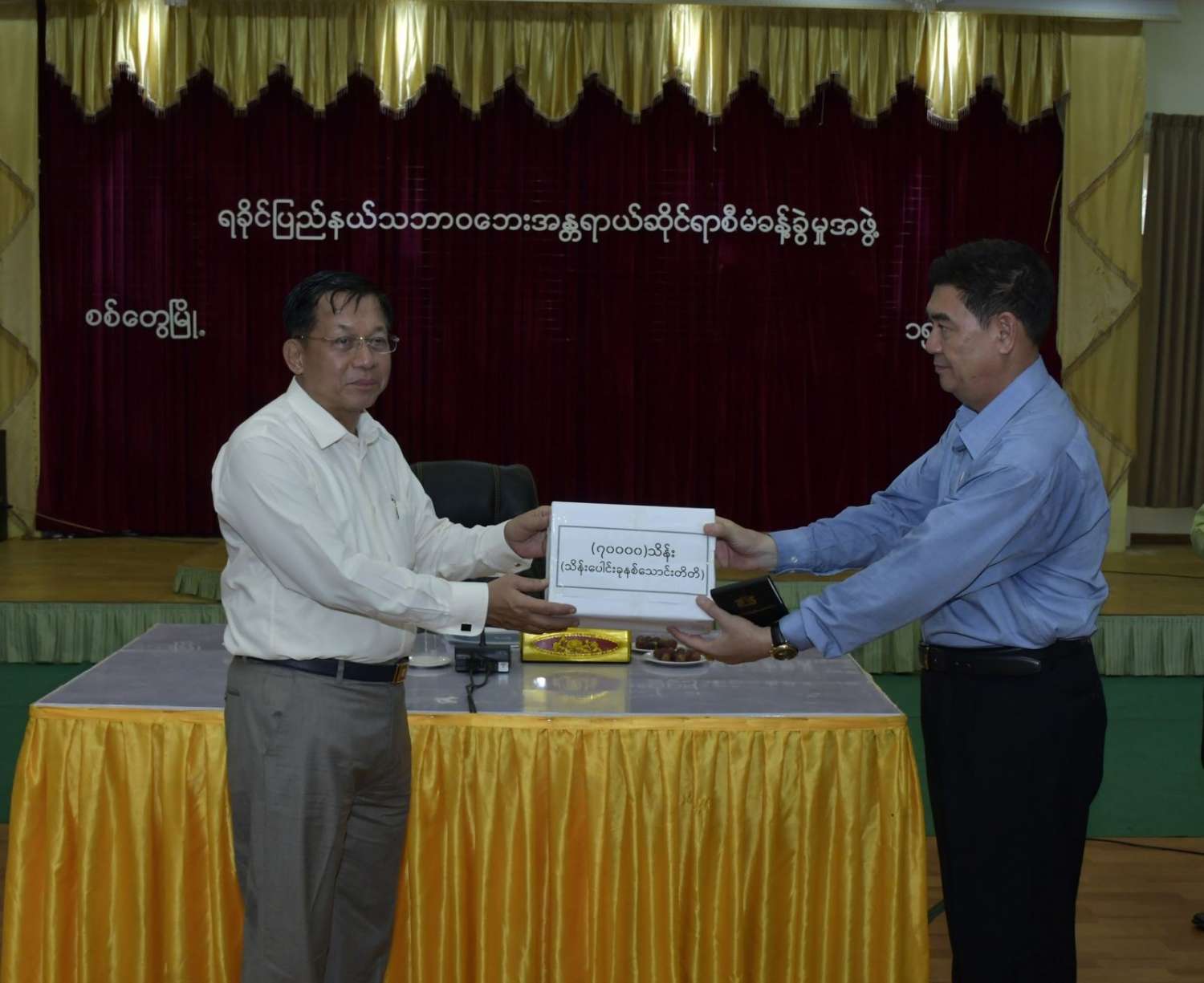 ထို့နောက် နိုင်ငံတော်စီမံအုပ်ချုပ်ရေးကောင်စီဥက္ကဋ္ဌ နိုင်ငံတော်ဝန်ကြီးချုပ်က ရခိုင်ပြည်နယ်အတွင်း ကူညီကယ်ဆယ်ရေးနှင့် ပြန်လည်ထူထောင်ရေးလုပ်ငန်းများ ဆောင်ရွက်နိုင်ရန်အတွက် ငွေကျပ် သိန်းပေါင်း ၇၀၀၀၀ နှင့် ထောက်ပံ့ရေးပစ္စည်းများကို ပေးအပ်ရာ ပြည်နယ်ဝန်ကြီးချုပ်က လက်ခံရယူသည်။