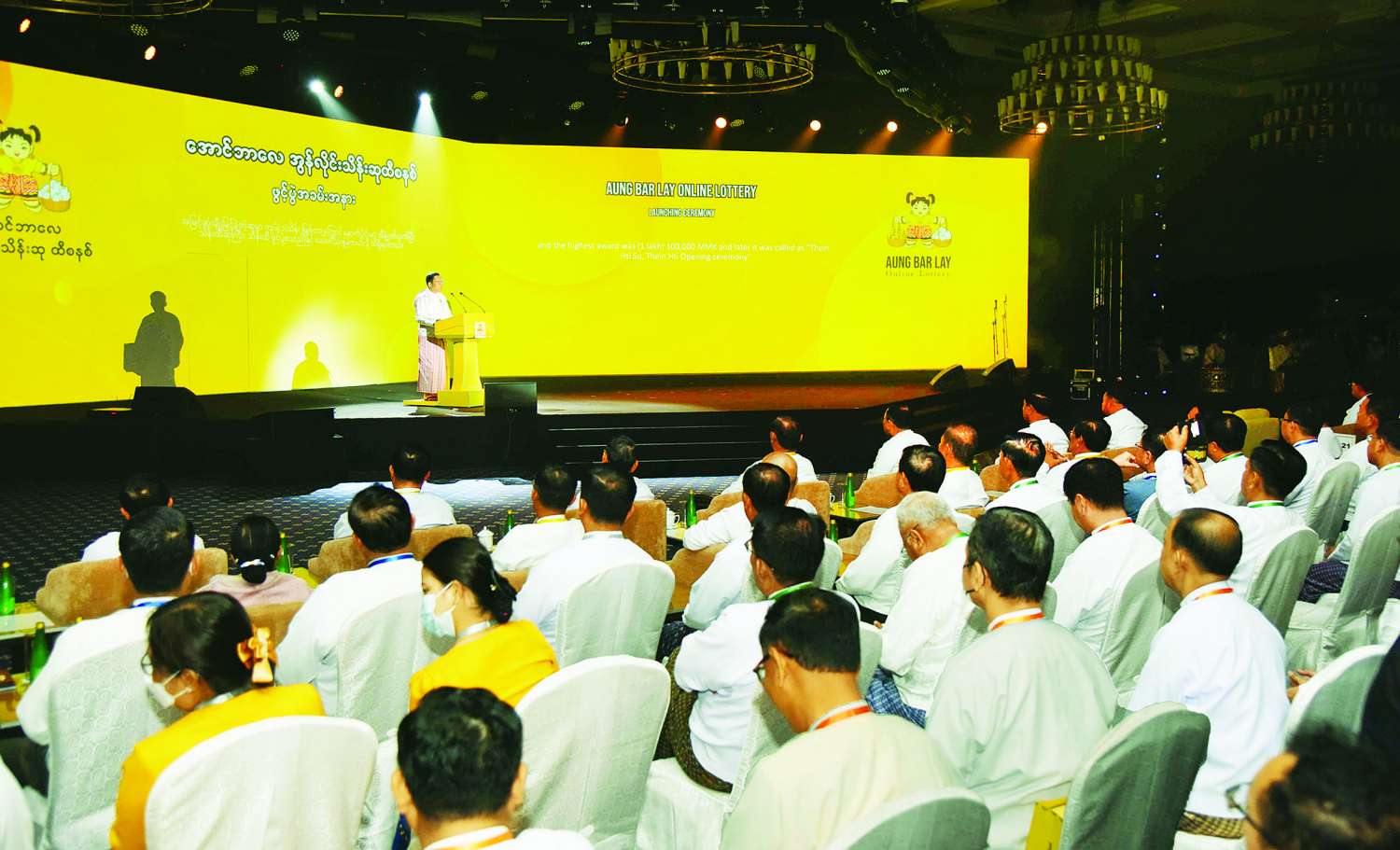 အောင်ဘာလေအွန်လိုင်းသိန်းဆုထီစနစ်စတင်ခြင်း ဖွင့်ပွဲအခမ်းအနားကို ယနေ့နံနက်ပိုင်းတွင် နေပြည်တော်ရှိ မြန်မာအပြည်ပြည်ဆိုင်ရာ ကွန်ဗင်းရှင်းဗဟိုဌာန-၂ ၌ ကျင်းပရာ နိုင်ငံတော်စီမံအုပ်ချုပ်ရေးကောင်စီဥက္ကဋ္ဌ နိုင်ငံတော်ဝန်ကြီးချုပ် ဗိုလ်ချုပ်မှူးကြီး မင်းအောင်လှိုင် တက်ရောက်အမှာစကားပြောကြားသည်။