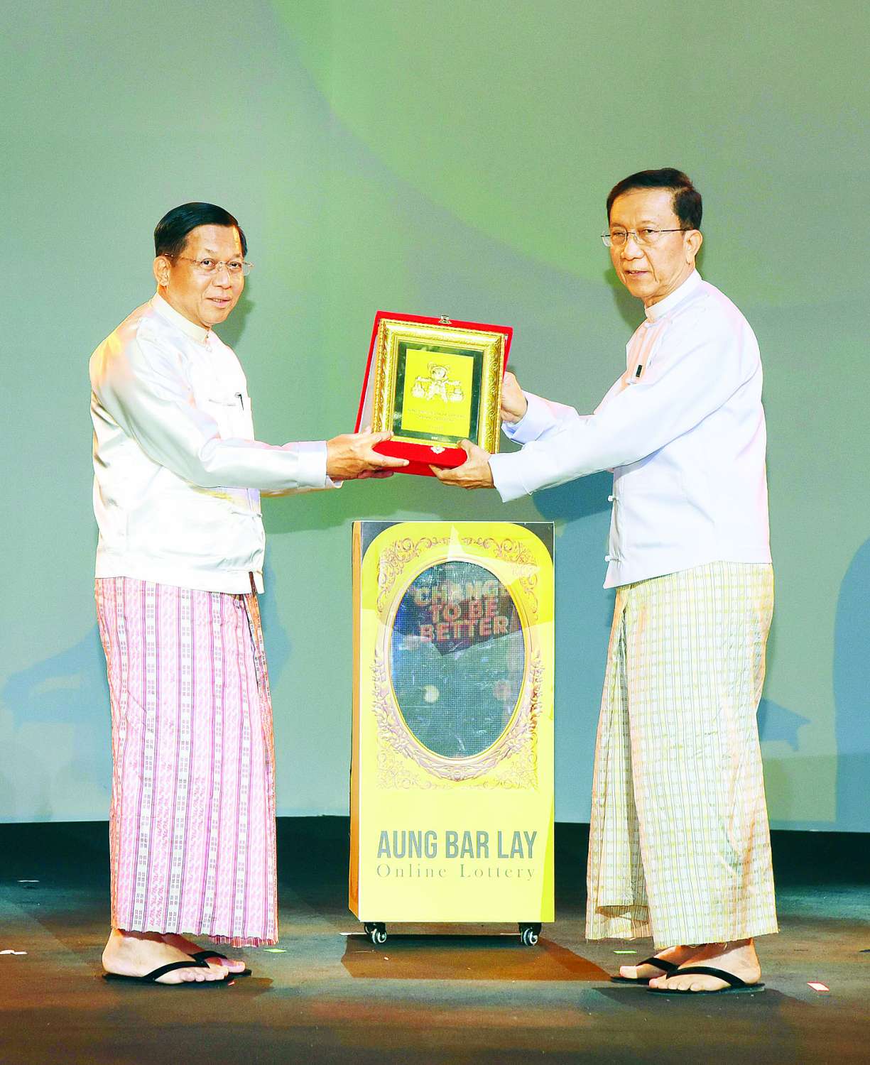 ထို့နောက် အောင်ဘာလေအွန်လိုင်း သိန်းဆုထီစနစ်ဖွင့်ပွဲ အထိမ်းအမှတ် Logo ကို နိုင်ငံတော်စီမံအုပ်ချုပ်ရေးကောင်စီဥက္ကဋ္ဌ နိုင်ငံတော်ဝန်ကြီးချုပ် ဗိုလ်ချုပ်မှူးကြီး မင်းအောင်လှိုင်ထံ ဒုတိယဝန်ကြီးချုပ်နှင့် ပြည်ထောင်စုဝန်ကြီး ဦးဝင်းရှိန်က ပေးအပ်သည်။