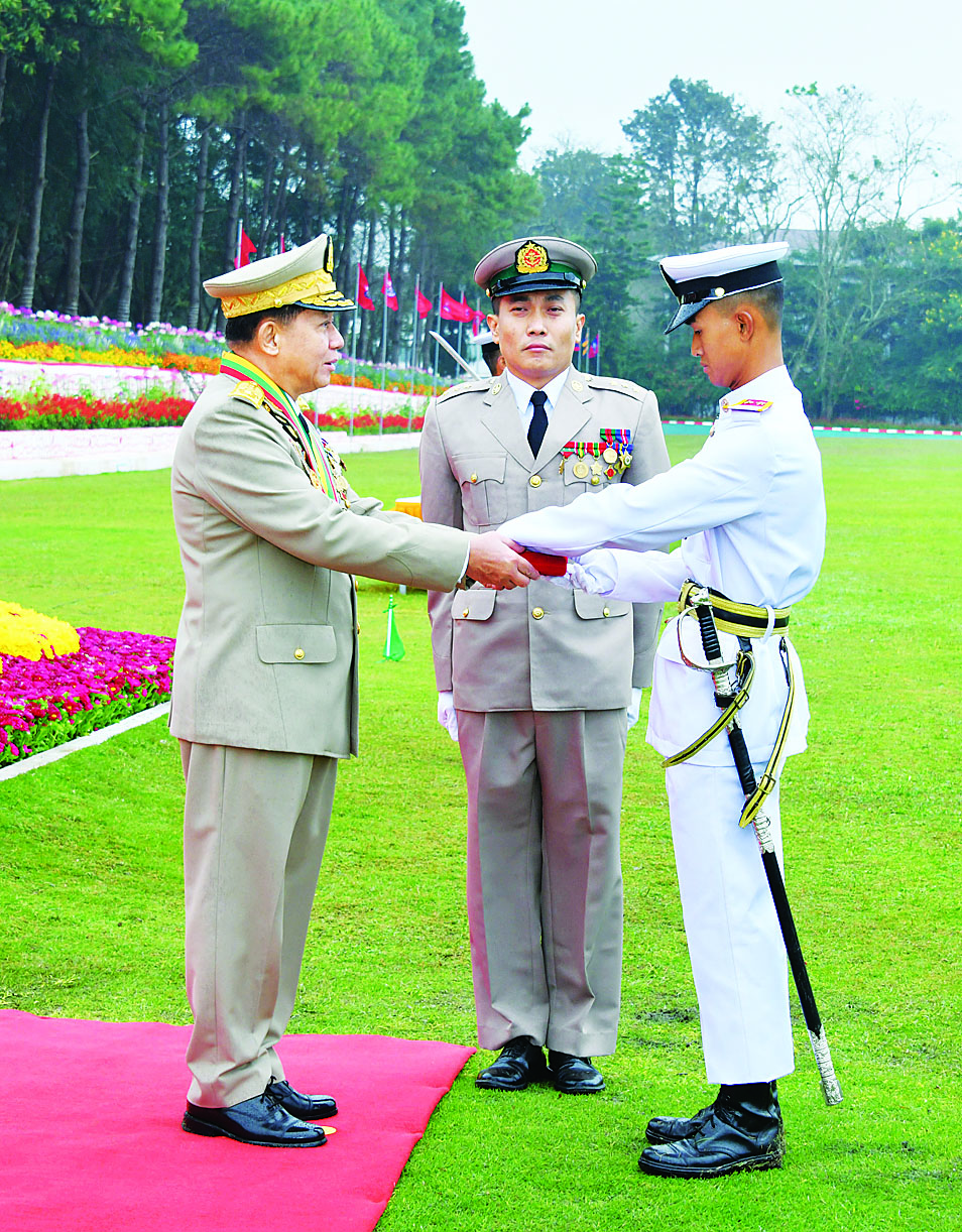 ဦးစွာ နိုင်ငံတော်စီမံအုပ်ချုပ်ရေးကောင်စီဥက္ကဋ္ဌ တပ်မတော်ကာကွယ်ရေးဦးစီးချုပ် ဗိုလ်ချုပ်မှူးကြီး သတိုးမဟာသရေစည်သူ သတိုးသီရိသုဓမ္မ မင်းအောင်လှိုင်သည် ဗိုလ်လောင်းတပ်ခွဲများ၏ အလေးပြုခြင်းကိုခံယူပြီး ကျောင်းဆင်းဗိုလ်လောင်းတပ်ခွဲများကို စစ်ဆေးသည်။