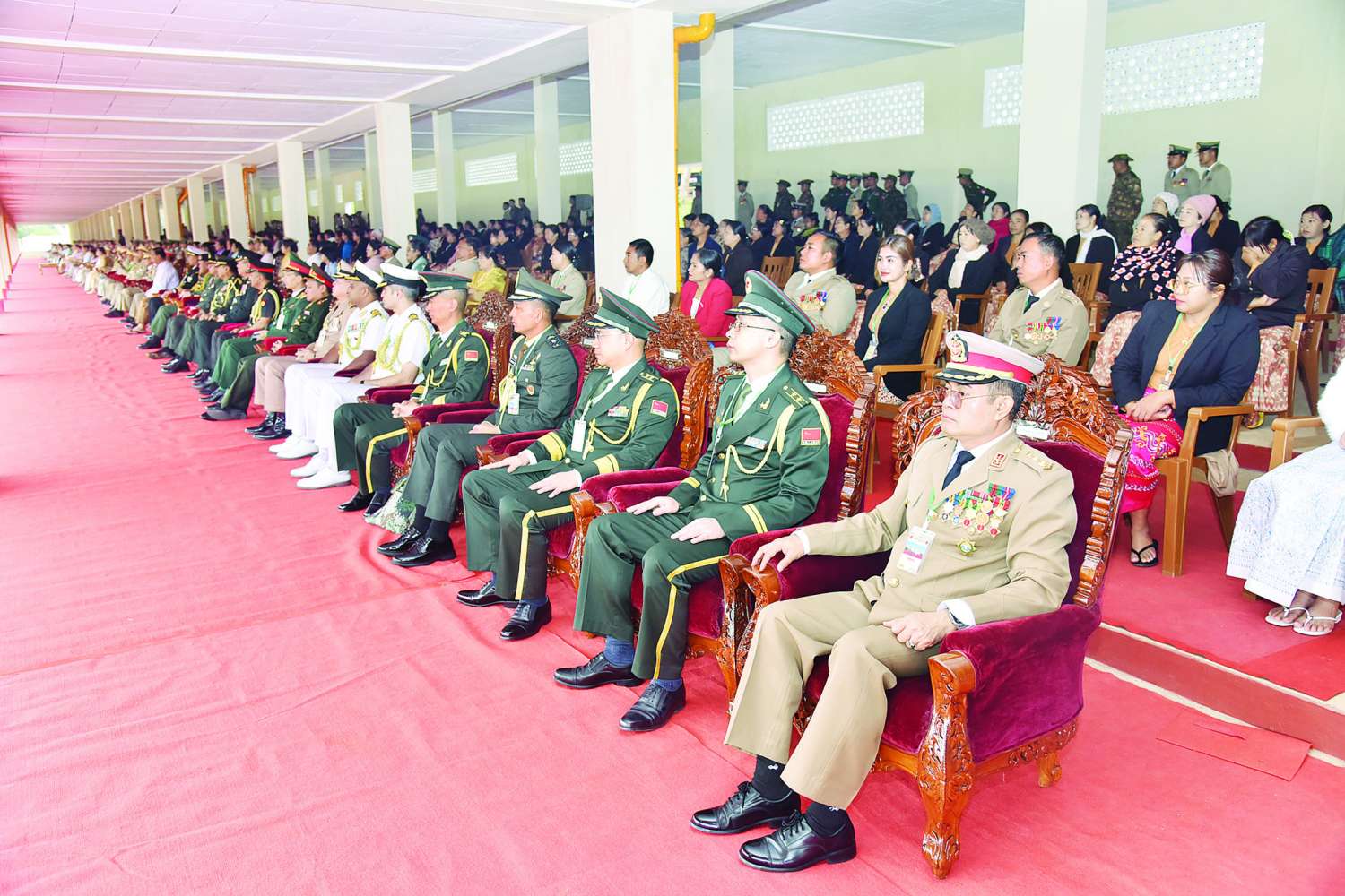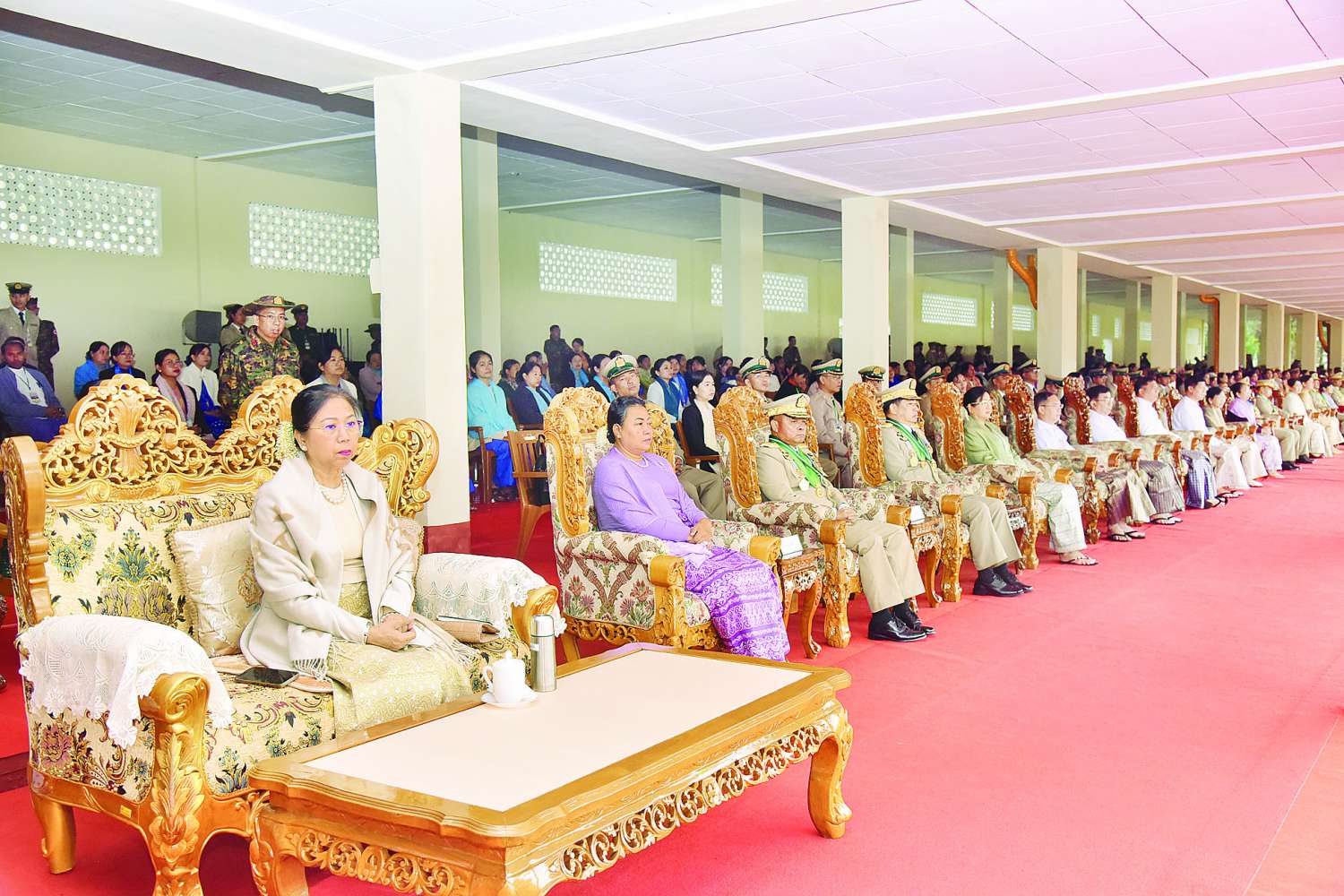 အဆိုပါ အခမ်းအနားသို့ နိုင်ငံတော်စီမံအုပ်ချုပ်ရေးကောင်စီဥက္ကဋ္ဌ တပ်မတော်ကာကွယ်ရေးဦးစီးချုပ်နှင့်အတူ ဇနီး ဒေါ်ကြူကြူလှ၊ ညှိနှိုင်းကွပ်ကဲရေးမှူး (ကြည်း၊ ရေ၊ လေ) ဗိုလ်ချုပ်ကြီး သီရိပျံချီ စည်သူမောင်မောင်အေးနှင့်ဇနီး၊ ကာကွယ်ရေးဦးစီးချုပ်(ရေ) ဗိုလ်ချုပ်ကြီး ဇေယျကျော်ထင် စည်သူမိုးအောင်နှင့်ဇနီး၊ ကာကွယ်ရေးဦးစီးချုပ် (လေ) ဗိုလ်ချုပ်ကြီး ဇေယျကျော်ထင် စည်သူထွန်းအောင်နှင့်ဇနီး၊ ကာကွယ်ရေးဦးစီးချုပ်ရုံးမှ တပ်မတော်အရာရှိကြီးများနှင့် ဇနီးများ၊ ပြည်ထောင်စုဝန်ကြီးများ၊ မန္တလေးတိုင်းဒေသကြီးဝန်ကြီးချုပ်နှင့်ဇနီး၊ အလယ်ပိုင်းတိုင်းစစ်ဌာနချုပ်တိုင်းမှူး၊ မြန်မာနိုင်ငံဆိုင်ရာ နိုင်ငံခြားစစ်သံရုံးများမှ စစ်သံမှူးများ၊ စစ်တက္ကသိုလ်ကျောင်းအုပ်ကြီး၊ ပြင်ဦးလွင်တပ်နယ်မှ တာဝန်ရှိသူများ၊ ကျောင်းဆင်းဗိုလ်လောင်းများ၏ မိဘအုပ်ထိန်းသူများဖြစ်သည့် စစ်တက္ကသိုလ်၊ စာပေဌာနနှင့် လေ့ကျင့်ရေးဌာနတို့မှ နည်းပြအရာရှိများနှင့် ဆရာ၊ ဆရာမများ၊ ဖိတ်ကြားထားသည့် ဧည့်သည်တော်များ တက်ရောက်ကြသည်။