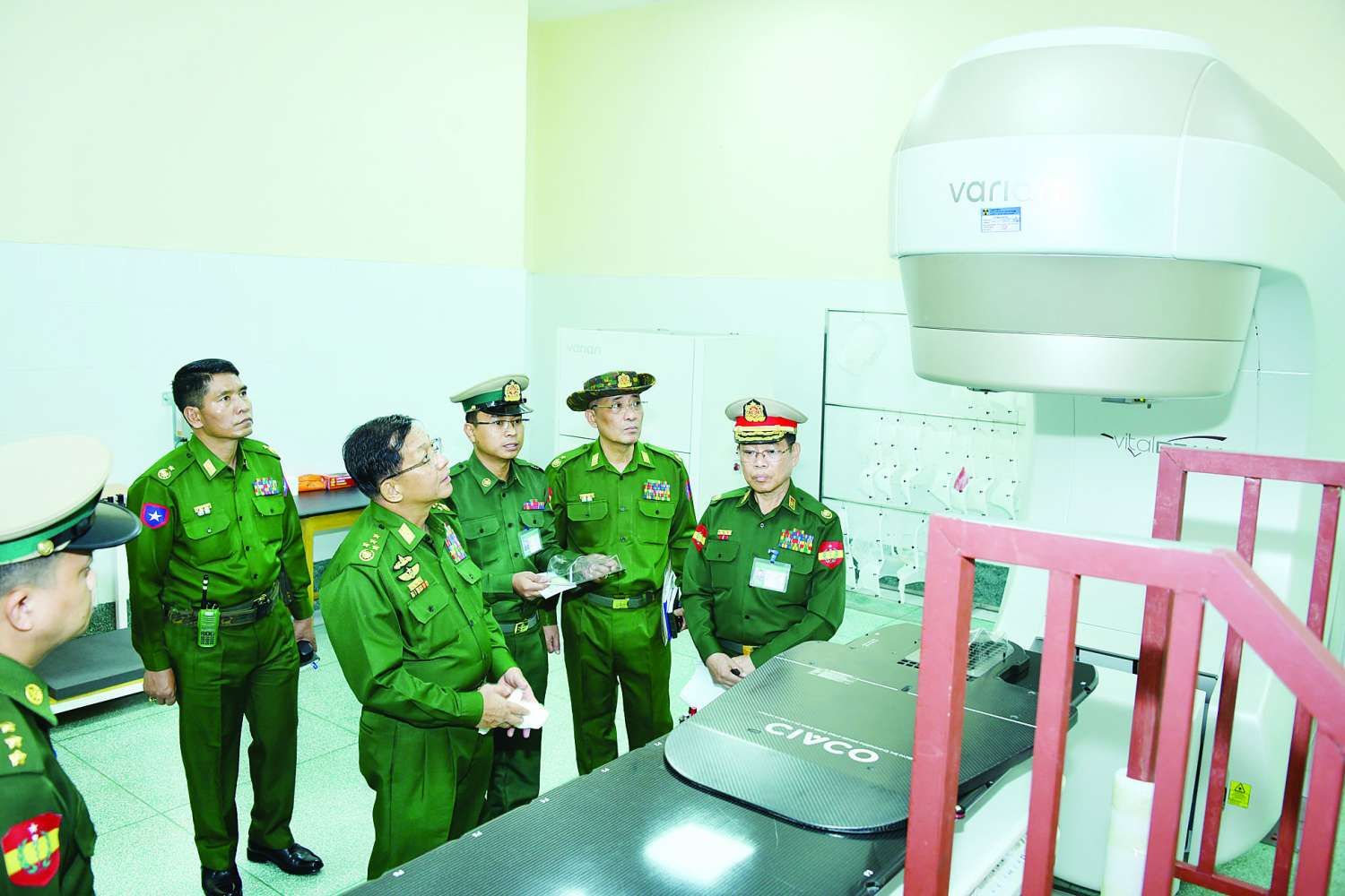 ထို့နောက် နိုင်ငံတော်စီမံအုပ်ချုပ်ရေးကောင်စီဥက္ကဋ္ဌ တပ်မတော်ကာကွယ်ရေးဦးစီးချုပ်နှင့်ဇနီး၊ အဖွဲ့ဝင်များသည် ဓာတ်ရောင်ခြည်နှင့် ကင်ဆာကုသဆောင်သို့ရောက်ရှိကြပြီး နိုင်ငံတော်စီမံအုပ်ချုပ်ရေးကောင်စီဥက္ကဋ္ဌ တပ်မတော်ကာကွယ်ရေးဦးစီးချုပ်သည် ဓာတ်ရောင်ခြည်ကုသစက်နှင့် CT စက်ဖြင့် ရောဂါရှိသည့် နေရာများအား တိကျစွာပုံဖော်သည့်စက်တို့ တပ်ဆင်သုံးစွဲထားမှု အခြေအနေများ ကြည့်ရှုစစ်ဆေးရာ ဆေးဝန်ထမ်းတပ်ဖွဲ့ ညွှန်ကြားရေးမှူးနှင့် တာဝန်ရှိသူများက ရှင်းလင်းတင်ပြကြသည်။