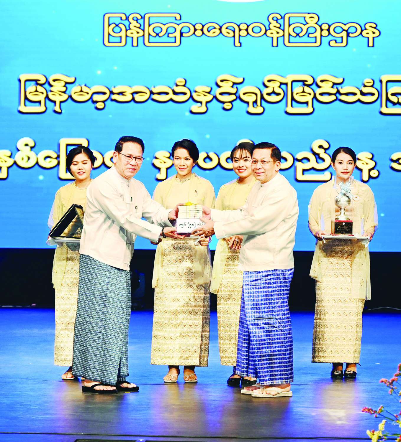ထို့နောက် နိုင်ငံတော်စီမံအုပ်ချုပ်ရေးကောင်စီဥက္ကဋ္ဌ နိုင်ငံတော်ဝန်ကြီးချုပ်က နိုင်ငံတော်အဆင့် အခမ်းအနားကြီးများကျင်းပခဲ့မှုတွင် မြန်မာ့အသံနှင့်ရုပ်မြင်သံကြားမှဝန်ထမ်းများက ကဏ္ဍစုံလင်စွာ ပါဝင်ဆောင်ရွက်နိုင်ခဲ့သည့်အတွက် ဂုဏ်ပြုဆုနှင့် မြန်မာ့အသံနှင့် ရုပ်မြင်သံကြားအတွက် ဂုဏ်ပြုချီးမြှင့်ငွေများကို ချီးမြှင့်ပေးအပ်ရာ ပြန်ကြားရေးဝန်ကြီးဌာန ပြည်ထောင်စုဝန်ကြီးက လက်ခံရယူသည်။