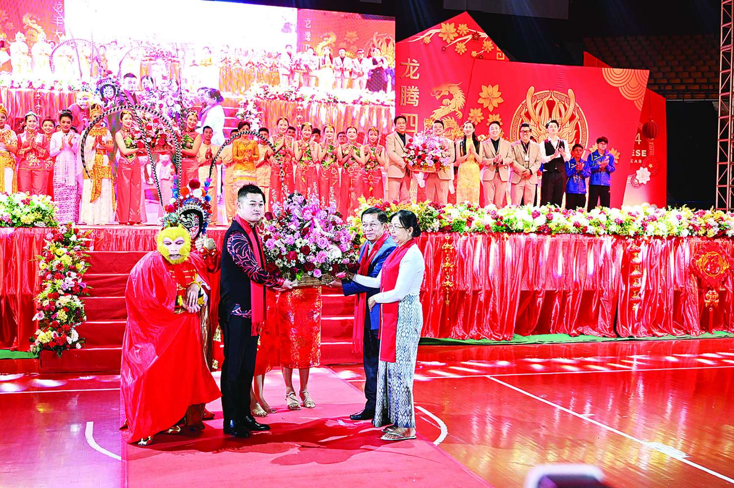 (၂၀၂၄) ခုနှစ် ရွှေနဂါးတရုတ်နှစ်သစ်ကူးပွဲတော်အခမ်းအနားကို ယနေ့ညနေပိုင်းတွင် ရန်ကုန်မြို့ရှိ အမျိုးသားအားကစားပြိုင်ပွဲရုံ (၁) သုဝဏ္ဏ၌ ကျင်းပပြုလုပ်ရာ နိုင်ငံတော်စီမံအုပ်ချုပ်ရေးကောင်စီဥက္ကဋ္ဌ နိုင်ငံတော်ဝန်ကြီးချုပ် ဗိုလ်ချုပ်မှူးကြီး မင်းအောင်လှိုင်နှင့် ဇနီး ဒေါ်ကြူကြူလှတို့ တက်ရောက်ချီးမြှင့်သည်။