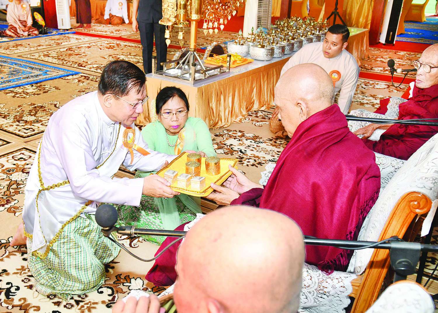 ထို့နောက် ကောင်စီတွဲဖက်အတွင်းရေးမှူး၊ ကောင်စီဝင်များ၊ ပြည်ထောင်စုဝန်ကြီးများနှင့် အခမ်းအနားတက်ရောက်လာကြသူများက လှူဖွယ်ပစ္စည်းများအား သံဃာတော်အရှင်သူမြတ်များထံ ဆက်ကပ်လှူဒါန်းကြသည်။