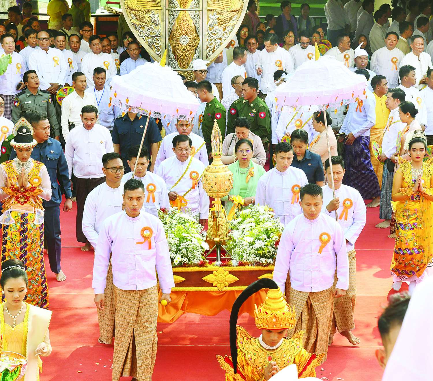အဆိုပါ အခမ်းအနားသို့ နိုင်ငံတော်စီမံအုပ်ချုပ်ရေးကောင်စီဥက္ကဋ္ဌ နိုင်ငံတော်ဝန်ကြီးချုပ် ဗိုလ်ချုပ်မှူးကြီး မင်းအောင်လှိုင်၊ ဇနီး ဒေါ်ကြူကြူလှနှင့် မိသားစုဝင်များ၊ ကောင်စီတွဲဖက်အတွင်းရေးမှူး ဒုတိယဗိုလ်ချုပ်ကြီး ရဲဝင်းဦးနှင့် ဇနီး၊ နိုင်ငံတော်စီမံအုပ်ချုပ်ရေးကောင်စီဝင်များဖြစ်ကြသည့် ဗိုလ်ချုပ်ကြီး မြထွန်းဦးနှင့်ဇနီး၊ ဒုတိယဗိုလ်ချုပ်ကြီး ညိုစောနှင့်ဇနီး၊ ပြည်ထောင်စုဝန်ကြီးများနှင့် ဇနီးများ၊ ရန်ကုန်တိုင်းဒေသကြီးဝန်ကြီးချုပ်၊ ပဲခူးတိုင်းဒေသကြီး ဝန်ကြီးချုပ်၊ ကာကွယ်ရေးဦးစီးချုပ်ရုံးမှ အဆင့်မြင့်တပ်မတော်အရာရှိကြီးများနှင့် ဇနီးများ၊ ရန်ကုန်တိုင်းစစ်ဌာနချုပ်တိုင်းမှူး၊ တောင်ပိုင်းတိုင်းစစ်ဌာနချုပ်တိုင်းမှူး၊ ပဲခူးတိုင်းဒေသကြီးအစိုးရအဖွဲ့မှ တာဝန်ရှိသူများ၊ ဌာနဆိုင်ရာများ၊ ဖိတ်ကြားထားသည့် ဧည့်သည်တော်များ၊ စေတနာရှင်အလှူရှင်များ၊ ဝတ်အသင်းအဖွဲ့များနှင့် ဒေသခံတိုင်းရင်းသား ပြည်သူများ စည်ကားသိုက်မြိုက်စွာ တက်ရောက်ကြသည်။