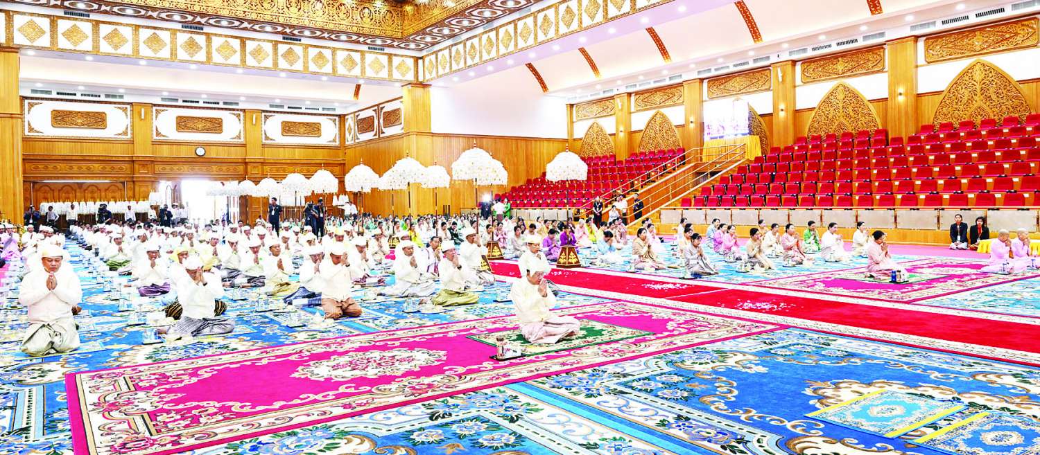 ထို့နောက် နိုင်ငံတော်စီမံအုပ်ချုပ်ရေးကောင်စီဥက္ကဋ္ဌ နိုင်ငံတော်ဝန်ကြီးချုပ်နှင့် ဇနီး၊ ဧည့်ပရိသတ်များက နိုင်ငံတော်သံဃမဟာနာယကအဖွဲ့ဥက္ကဋ္ဌ သန်လျင်မင်းကျောင်း ဆရာတော်ဘုရားကြီးထံမှ ငါးပါးသီလခံယူဆောက်တည်ကြသည်။