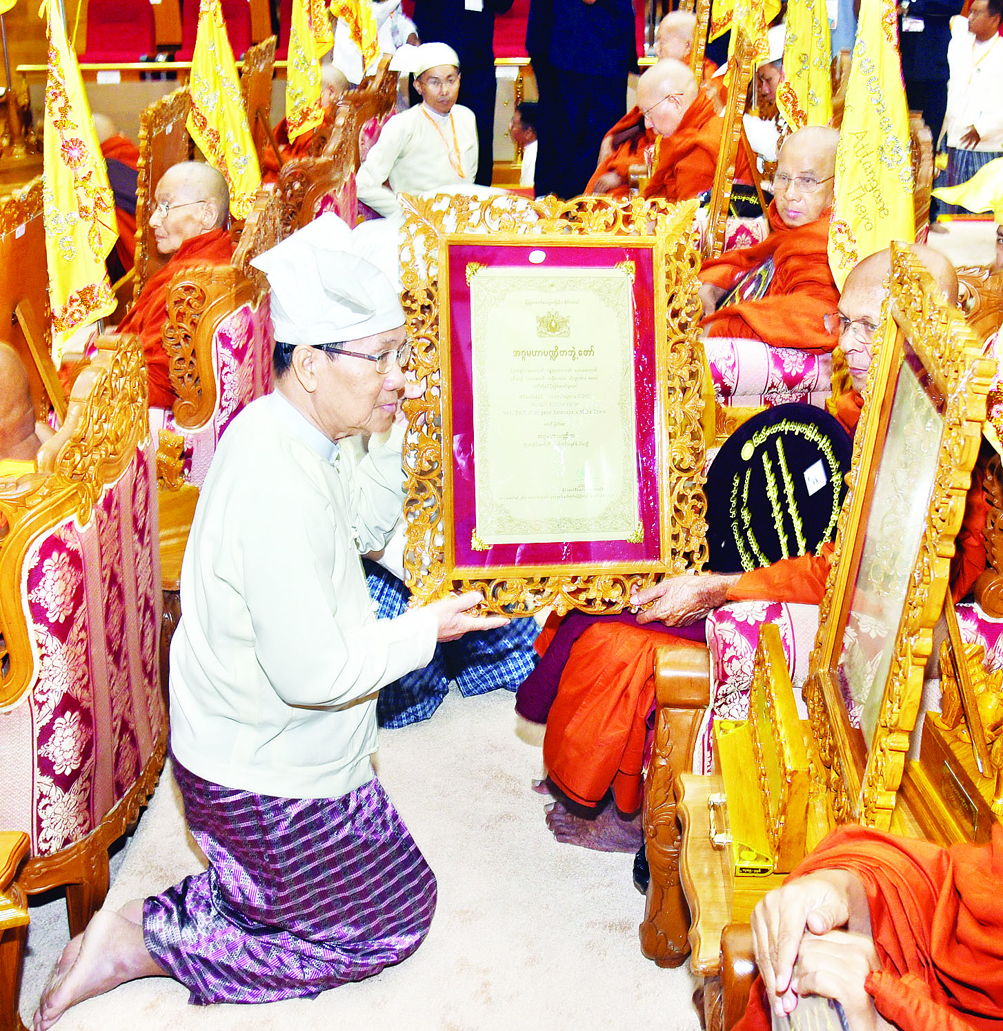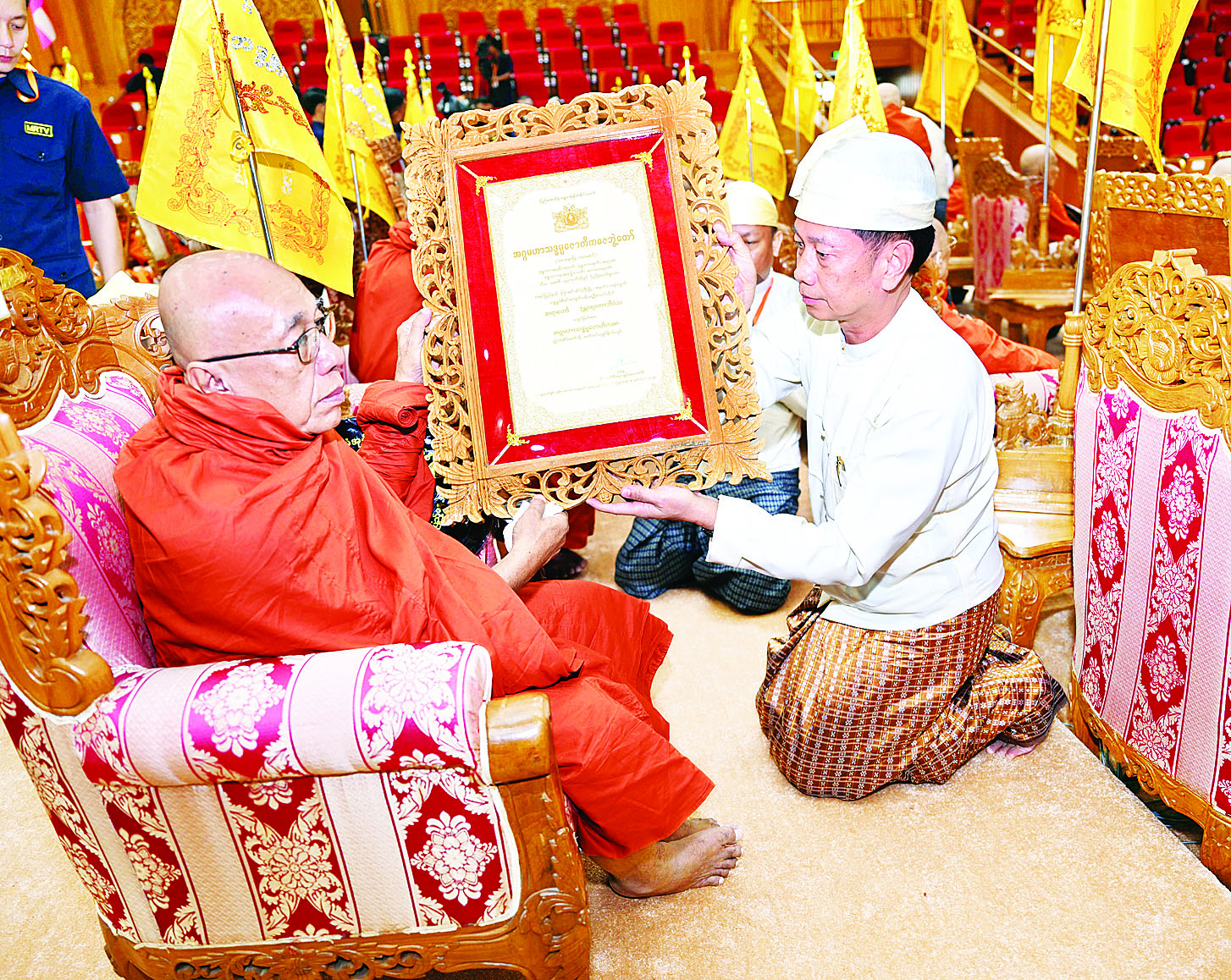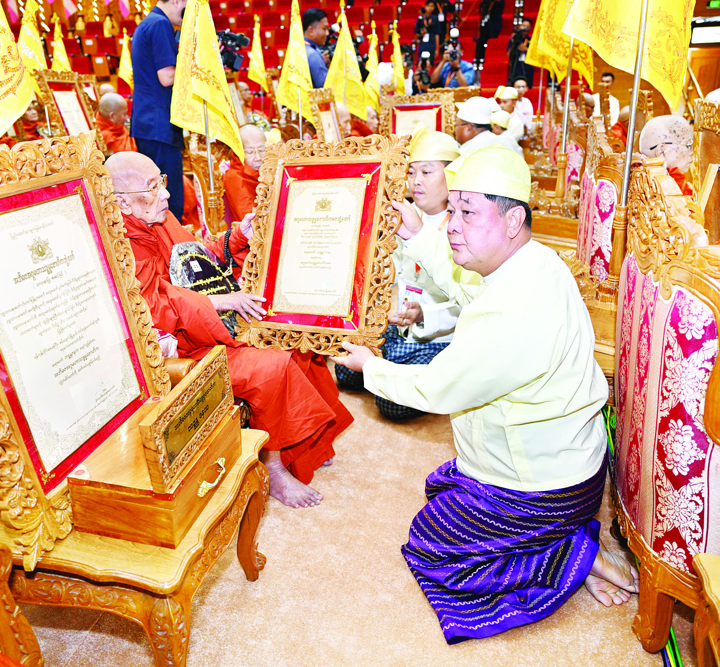 ဆက်လက်၍ ကောင်စီဝင်များ၊ ပြည်ထောင်စုအဆင့်ပုဂ္ဂိုလ်များ၊ ပြည်ထောင်စုဝန်ကြီးများ၊ ကာကွယ်ရေးဦးစီးချုပ်ရုံးမှ တပ်မတော်အရာရှိကြီးများနှင့် တာဝန်ရှိသူများက အဘိဓဇအဂ္ဂမဟာ သဒ္ဓမ္မဇောတိက၊ အဘိဓဇမဟာရဋ္ဌဂုရု၊ အဂ္ဂမဟာပဏ္ဍိတ၊ အဂ္ဂမဟာ သဒ္ဓမ္မဇောတိကဓဇ၊ အဂ္ဂမဟာ ဂန္ထဝါစက ပဏ္ဍိတ၊ အဂ္ဂမဟာ ကမ္မဋ္ဌာနာစရိယဘွဲ့ရရှိသည့် ဆရာတော်ကြီးများထံ ဘွဲ့တံဆိပ်တော်နှင့် အဆောင်အယောင်များကို ဆက်ကပ်ပူဇော်ကြသည်။