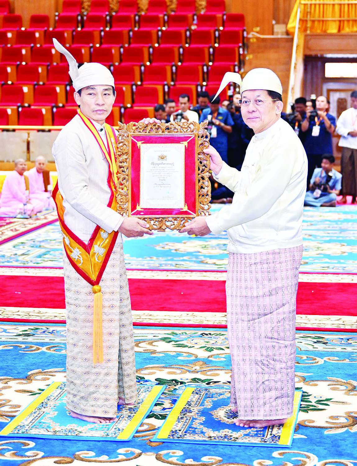ဆက်လက်၍ သာသနာနုဂ္ဂဟဘွဲ့တံဆိပ်များကို ချီးမြှင့်အပ်နှင်းရာ နိုင်ငံတော်စီမံအုပ်ချုပ်ရေးကောင်စီဥက္ကဋ္ဌ နိုင်ငံတော်ဝန်ကြီးချုပ်က အဂ္ဂမဟာသီရိသုဓမ္မ မဏိဇောတဓရ ဘွဲ့ရရှိသူ ဒေါက်တာမောင်မောင်ဦး၊ သီရိသုဓမ္မမဏိဇောတဓရဘွဲ့ ရရှိသူများဖြစ်ကြသည့် ဦးမန်းစိန်နှင့် ဦးဝမ်ရှင်းရွှေတို့အား ဘွဲ့တံဆိပ်နှင့် အဆောင်အယောင်များ ချီးမြှင့်အပ်နှင်းသည်။