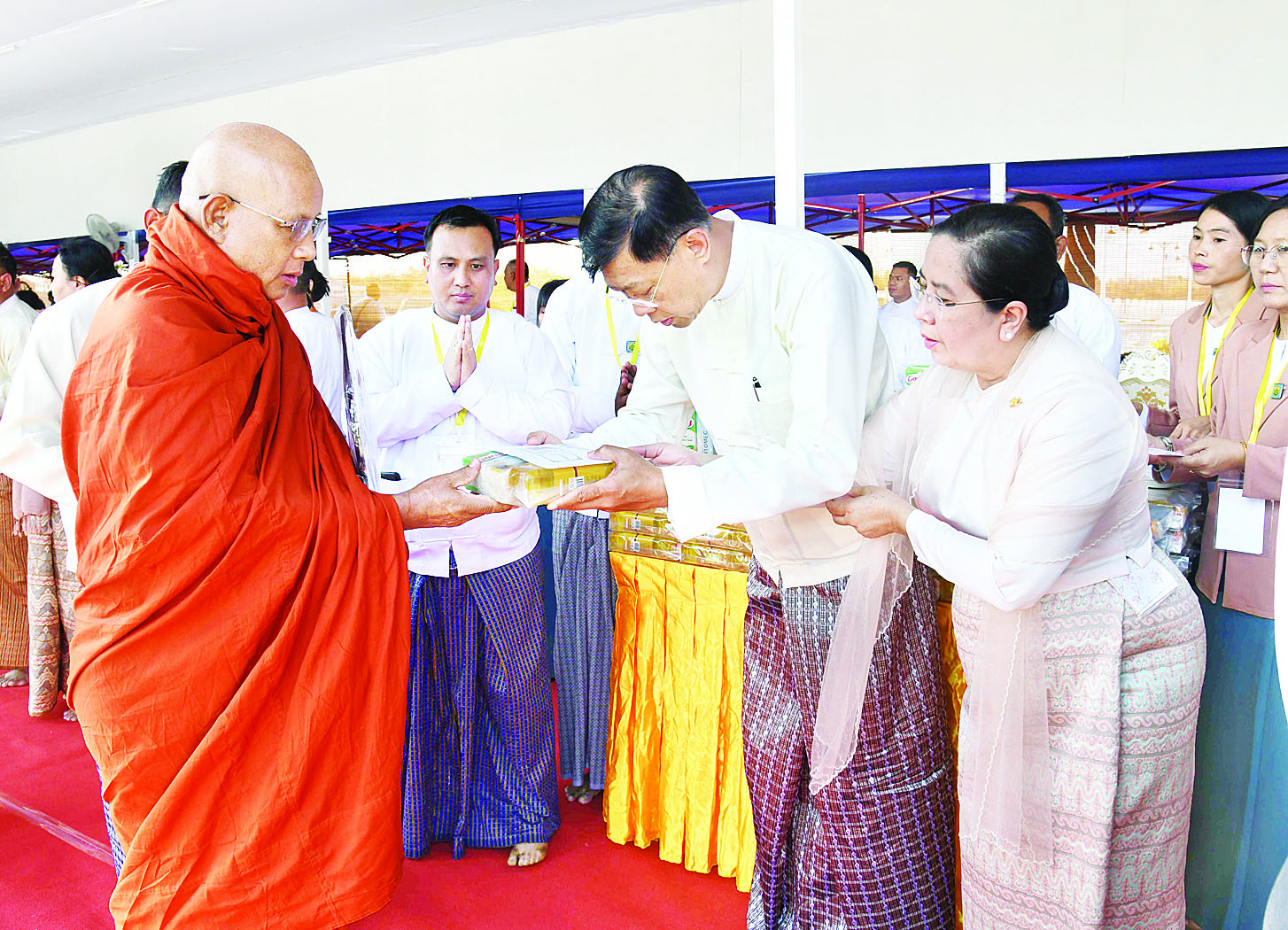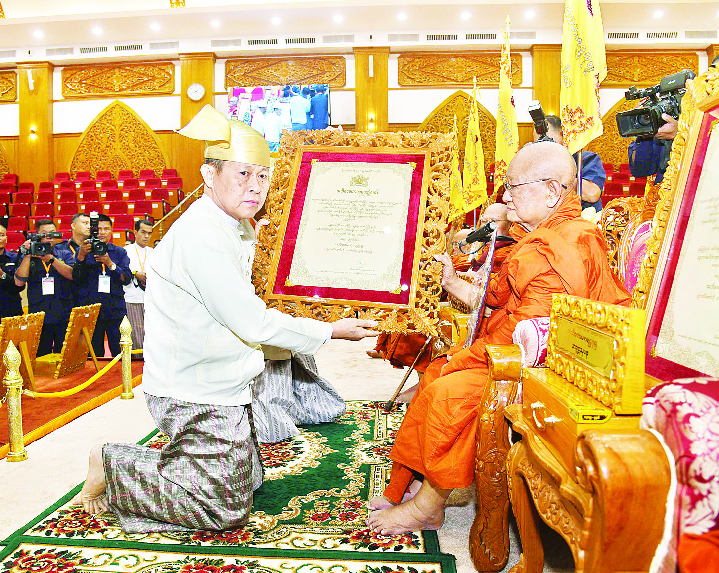 ၂၀၂၄ ခုနှစ် သာသနာတော်ဆိုင်ရာ ဘွဲ့တံဆိပ်တော်များ ဆက်ကပ်ပူဇော်ပွဲ မဟာမင်္ဂလာအခမ်းအနားနှင့် ဆွမ်းဆန်စိမ်းလောင်းလှူပွဲအခမ်းအနားကို ယနေ့မွန်းလွဲပိုင်းတွင် နေပြည်တော်၊ မာရဝိဇယဗုဒ္ဓဥယျာဉ်တော်ပရိဝုဏ်အတွင်းရှိ အဂ္ဂါဓိပတိသာသနာ့ဗိမာန်တော်ကြီး၌ ကျင်းပရာ နိုင်ငံတော်စီမံအုပ်ချုပ်ရေးကောင်စီဥက္ကဋ္ဌ နိုင်ငံတော်ဝန်ကြီးချုပ် ဗိုလ်ချုပ်မှူးကြီး မင်းအောင်လှိုင်နှင့် ဇနီး ဒေါ်ကြူကြူလှတို့ တက်ရောက်ကြည်ညို၍ သာသနာတော်ဆိုင်ရာ ဘွဲ့တံဆိပ်တော်များ ဆက်ကပ်ပူဇော်ပြီး ဆွမ်းဆန်စိမ်းများ လောင်းလှူကြသည်။