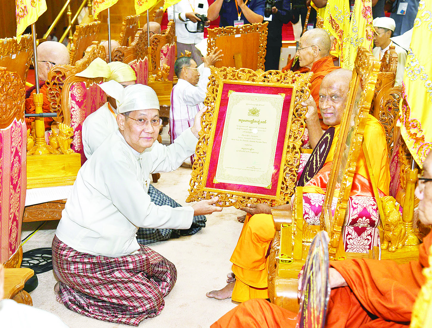 ထို့နောက် ဘွဲ့တံဆိပ်တော်ရ ဆရာတော်ကြီးများအား သာသနာတော်ဆိုင်ရာ ဘွဲ့တံဆိပ်တော်များ ဆက်ကပ်ပူဇော်ကြရာ နိုင်ငံတော်စီမံအုပ်ချုပ်ရေးကောင်စီဥက္ကဋ္ဌ နိုင်ငံတော်ဝန်ကြီးချုပ်က အဘိဓဇမဟာရဋ္ဌဂုရု ဘွဲ့တံဆိပ်တော်ရ မော်လမြိုင်မြို့၊ ဗုဒ္ဓသာသနာ့သိပ္ပံကျောင်းနှင့် စိန်မမပါဠိတက္ကသိုလ်ကျောင်းတိုက်ဆရာတော် ဘဒ္ဒန္တသုမနထံ ဘွဲ့တံဆိပ်တော်နှင့် အဆောင်အယောင်များကို ဆက်ကပ်ပူဇော်သည်။