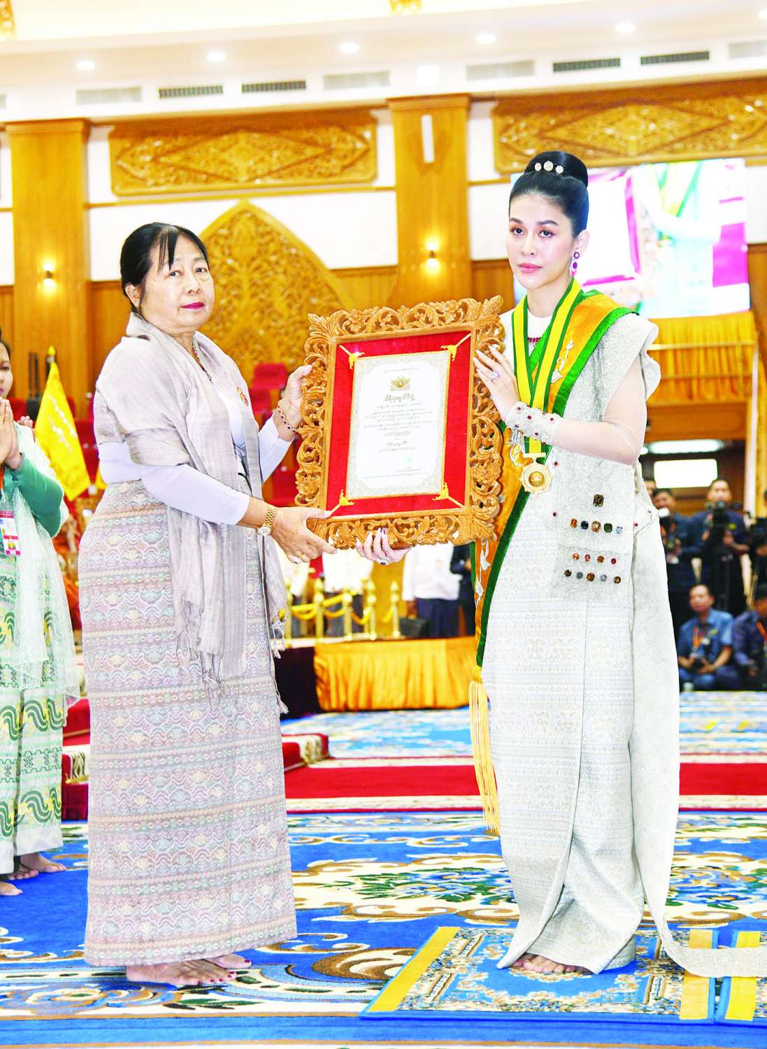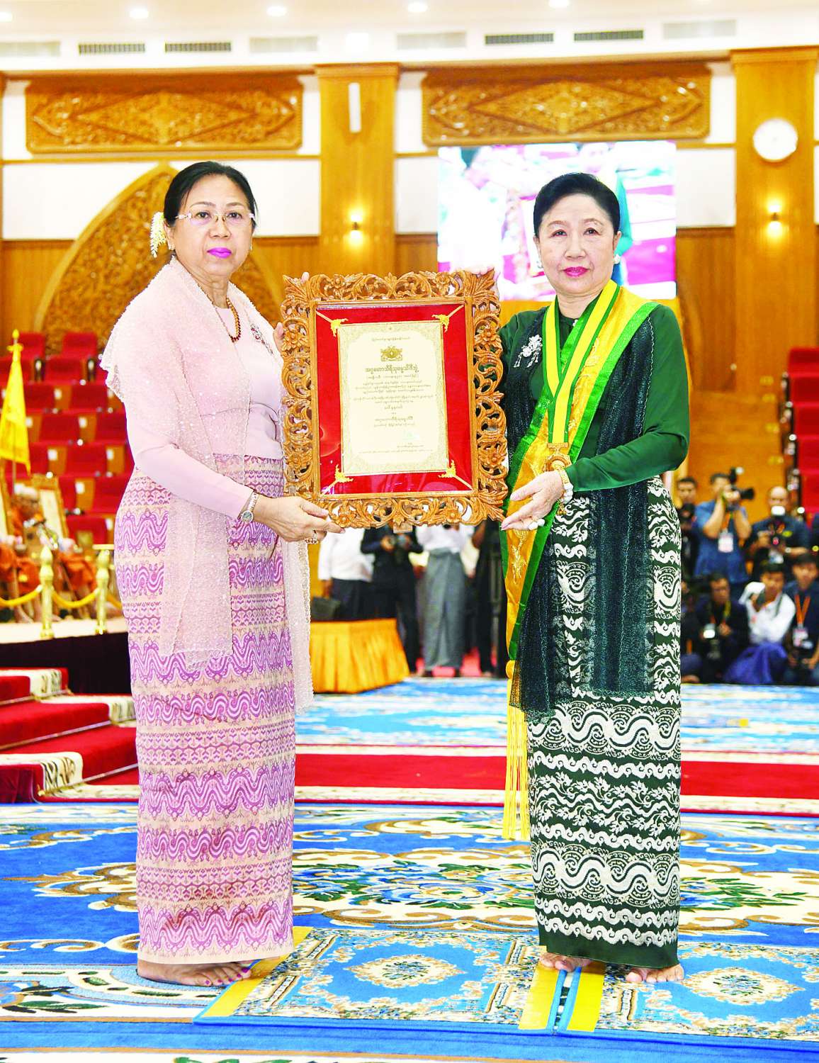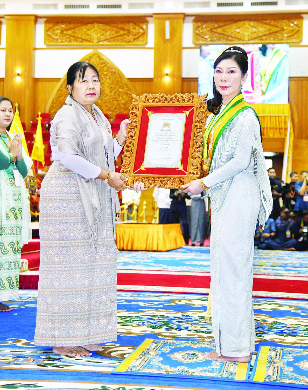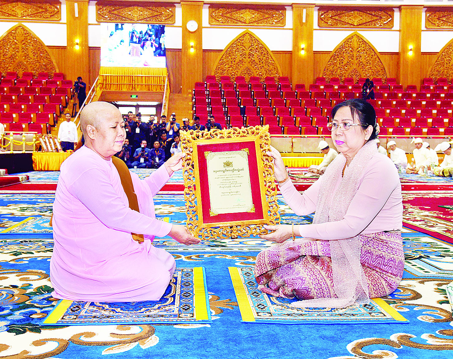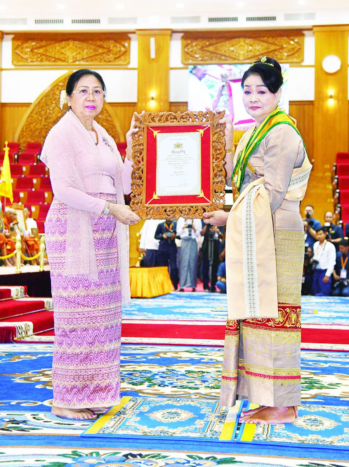ထို့နောက် နိုင်ငံတော်စီမံအုပ်ချုပ်ရေးကောင်စီဥက္ကဋ္ဌ နိုင်ငံတော်ဝန်ကြီးချုပ်၏ ဇနီးက အဂ္ဂမဟာသီရိ သုဓမ္မသိင်္ဂီဘွဲ့ရရှိကြသည့် ဒေါ်စန်းစန်းဝေနှင့် ဒေါ်နုနုငယ်၊ သီရိသုဓမ္မသိင်္ဂီဘွဲ့ ရရှိကြသည့် ဒေါ်တင်ညွန့်၊ ဒေါ်မြဝင်းနှင့် ဒေါ်နီနီကျော်တို့အားလည်းကောင်း၊ နိုင်ငံတော်စီမံအုပ်ချုပ်ရေးကောင်စီ ဒုတိယဥက္ကဋ္ဌ၊ ဒုတိယဝန်ကြီးချုပ်၏ ဇနီးက သီရိသုဓမ္မသိင်္ဂီဘွဲ့ရရှိကြသည့် ဒေါ်မော်မော်ညွန့်၊ ဒေါ်ဌေးဌေးယဉ်နှင့် ဒေါ်ခိုင်ပြည့်စုံကြိုင်တို့အားလည်းကောင်း ဘွဲ့တံဆိပ်နှင့် အဆောင်အယောင်များကို ချီးမြှင့်အပ်နှင်းသည်။