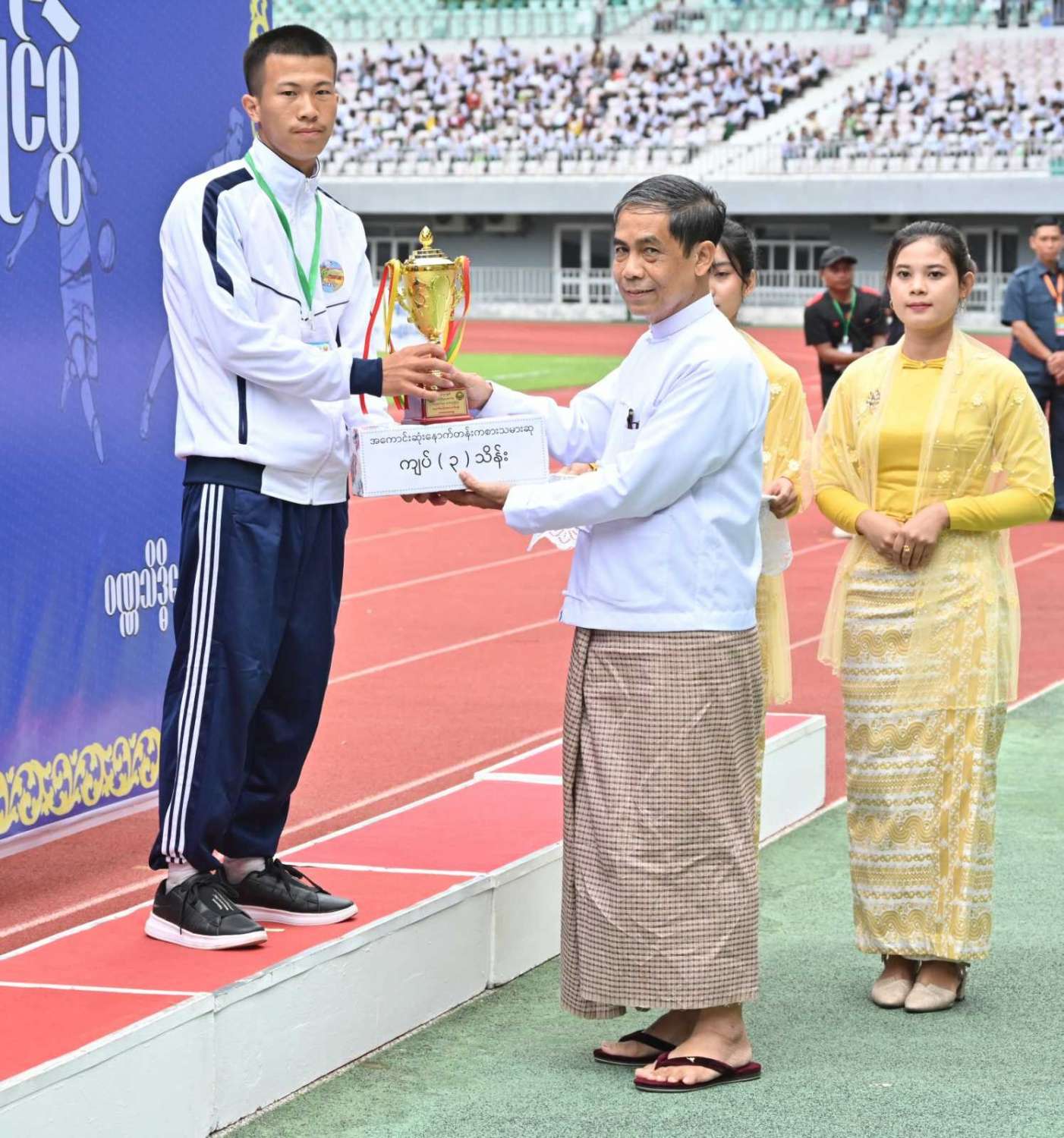 နိုင်ငံတော်စီမံအုပ်ချုပ်ရေးကောင်စီဥက္ကဋ္ဌ နိုင်ငံတော်ဝန်ကြီးချုပ် ဗိုလ်ချုပ်မှူးကြီး မင်းအောင်လှိုင် ၂ဝ၂၄ ခုနှစ်၊ ဝန်ကြီးဌာနပေါင်းစုံ တက္ကသိုလ်များဘောလုံးပြိုင်ပွဲ ဗိုလ်လုပွဲသို့ တက်ရောက်ကြည့်ရှုအားပေးပြီး ဆုများပေးအပ်ချီးမြှင့်