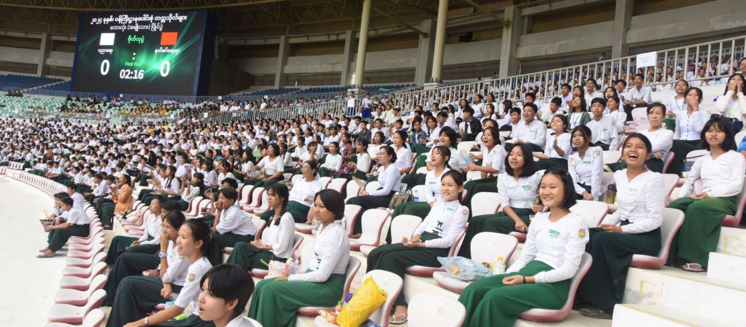 ဦးစွာ နိုင်ငံတော်စီမံအုပ်ချုပ်ရေးကောင်စီဥက္ကဋ္ဌ နိုင်ငံတော်ဝန်ကြီးချုပ်နှင့် တက်ရောက်လာကြသူများသည် ၂၀၂၄ ခုနှစ်၊ ဝန်ကြီးဌာနပေါင်းစုံ တက္ကသိုလ်များဘောလုံးပြိုင်ပွဲ ဗိုလ်လုပွဲအဖြစ် ပညာရေးဝန်ကြီးဌာန ကိုယ်စားပြုအသင်းနှင့် နယ်စပ်ရေးရာဝန်ကြီးဌာန ကိုယ်စားပြုအသင်းတို့ ယှဉ်ပြိုင်ကစားမှုကို ကြည့်ရှုအားပေးသည်။