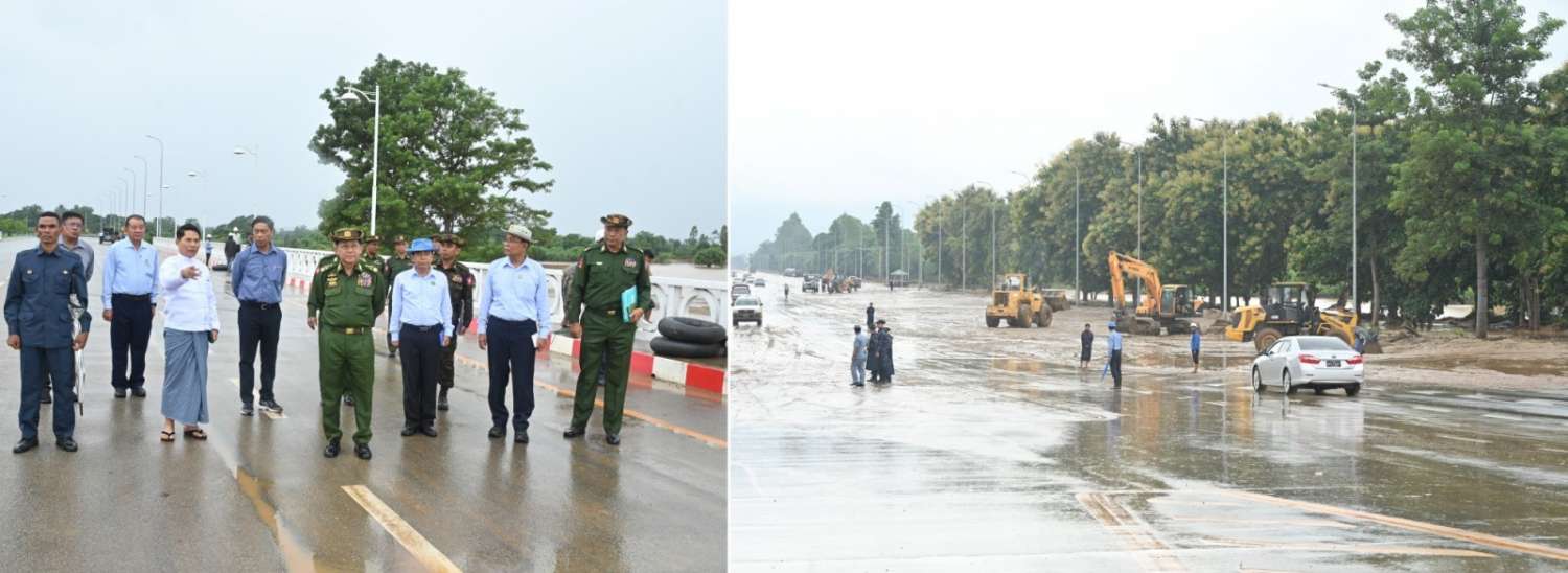 နိုင်ငံတော်စီမံအုပ်ချုပ်ရေးကောင်စီဥက္ကဋ္ဌ တပ်မတော်ကာကွယ်ရေးဦးစီးချုပ် ဗိုလ်ချုပ်မှူးကြီး မင်းအောင်လှိုင် နေပြည်တော်ကောင်စီနယ်မြေအတွင်း မိုးအဆက်မပြတ်ရွာသွန်းမှုကြောင့် ပျက်စီးမှုများဖြစ်ပေါ်ခဲ့သည့် လမ်းတံတားများ ပြန်လည်ပြုပြင်ဆောင်ရွက်နေမှုနှင့် ရေကြီးရေလျှံမှုအခြေအနေများအား လိုက်လံကြည့်ရှုစစ်ဆေး