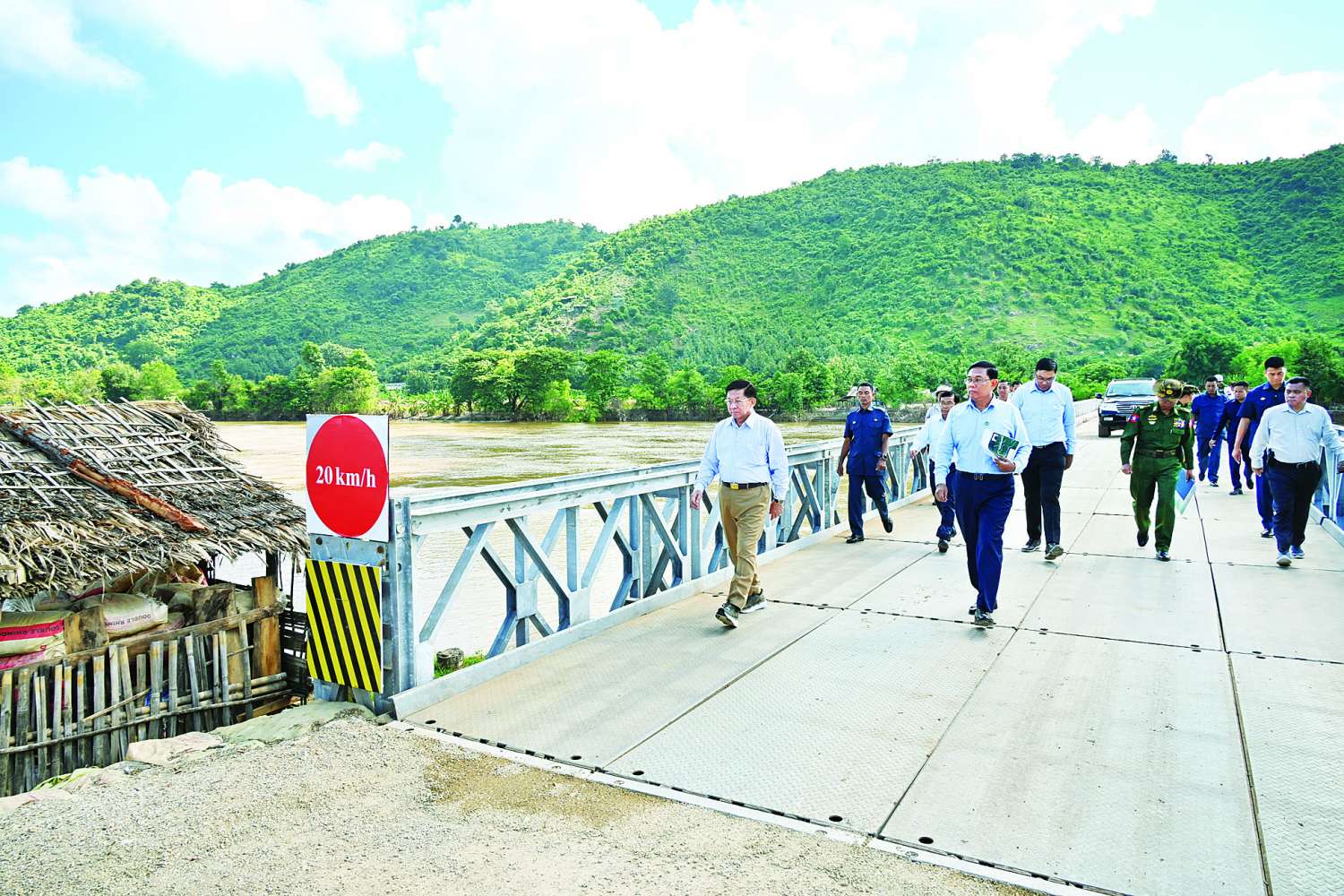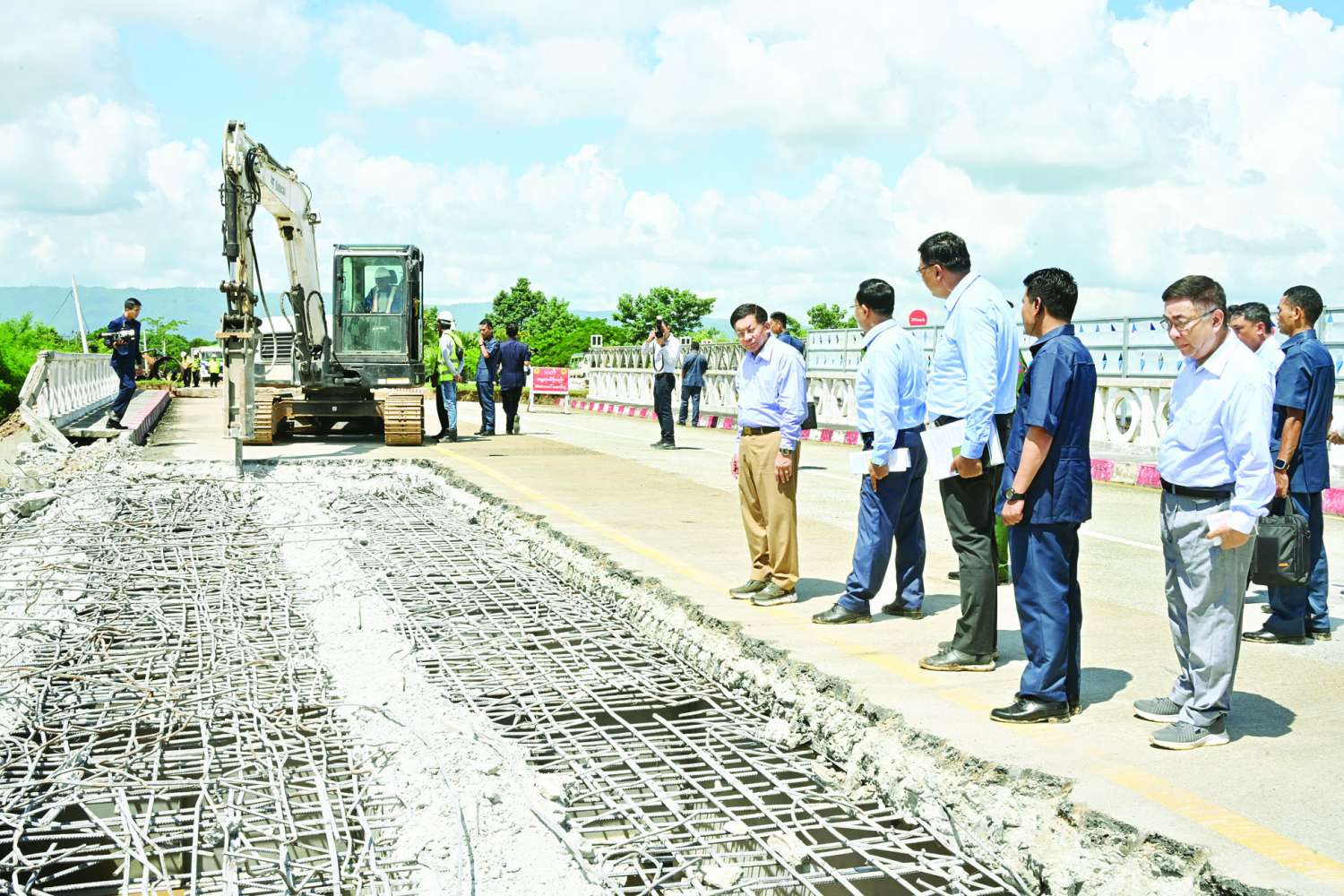 ရှင်းလင်းတင်ပြမှုများအပေါ် နိုင်ငံတော်စီမံအုပ်ချုပ်ရေးကောင်စီဥက္ကဋ္ဌ နိုင်ငံတော်ဝန်ကြီးချုပ်က ပျက်စီးသွားသည့်တံတားများ ပြန်လည်ပြုပြင်တည်ဆောက်ရာတွင် ရေရှည်တည်တံ့ခိုင်မြဲရေး၊ သဘာဝဘေးဒဏ်ခံနိုင်ရေးနှင့် ရေကြီးရေလျှံမှုများဖြစ်ပေါ်ချိန်တွင် အရှိန်အဟုန်ဖြင့် ရေစီးဆင်းမှုဒဏ်ကို ခံနိုင်ရေးတို့အတွက် စနစ်တကျထည့်သွင်းတွက်ချက်၍ ပြန်လည်ပြင်ဆင်ဆောင်ရွက်သွားရန်လိုကြောင်းနှင့် အခြားလိုအပ်သည်များကို မှာကြားပြီး ဆောက်လုပ်ရေးဝန်ထမ်းများအတွက် စားသောက်ဖွယ်ရာများကို ချီးမြှင့်ပေးအပ်သည်။