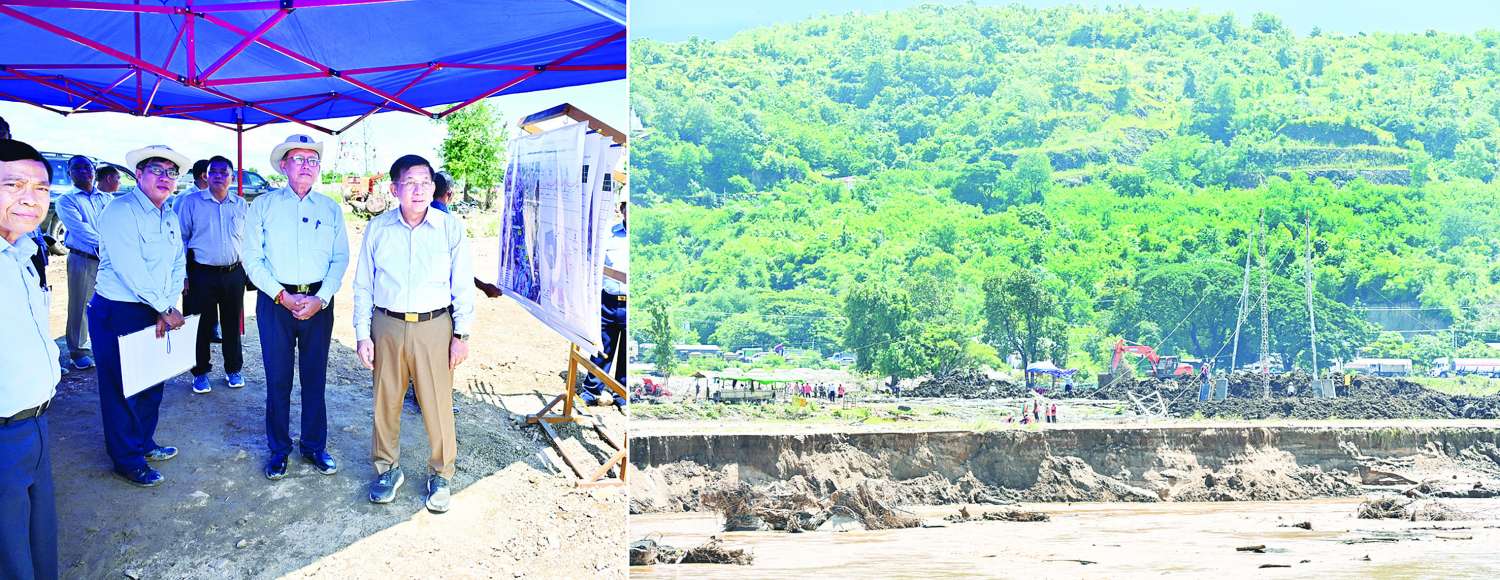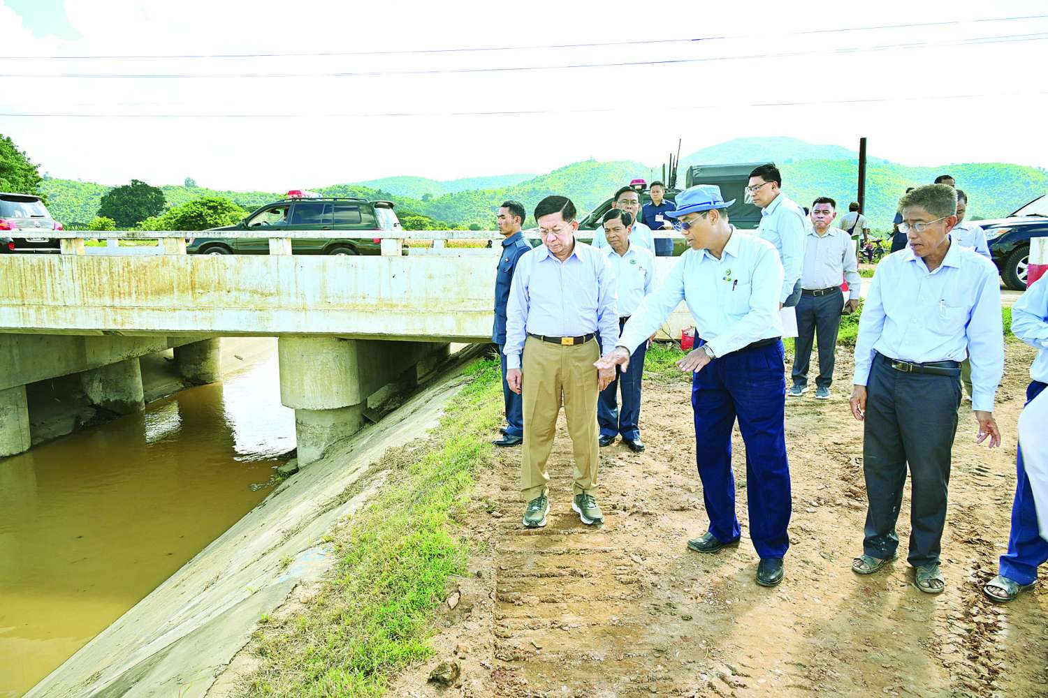 ဆက်လက်၍ နိုင်ငံတော်စီမံအုပ်ချုပ်ရေးကောင်စီဥက္ကဋ္ဌ နိုင်ငံတော်ဝန်ကြီးချုပ်နှင့် အဖွဲ့ဝင်များသည် ပေါင်းလောင်း (အဝေရာဆည်) လက်ယာရေပေးမြောင်းမကြီး၌ ရေတိုက်စားခံရမှုကြောင့် မြောင်းတာပေါင်ကျိုးပေါက်ခဲ့သည့်နေရာများအား ပြန်လည်ပြင်ဆင်ခြင်း ဆောင်ရွက်နေမှုနှင့် ရေကြီးရေလျှံမှု ဖြစ်ပေါ်ခဲ့သည့်အခြေအနေများကို ကြည့်ရှုစစ်ဆေးရာ တာဝန်ရှိသူများက ရှင်းလင်းတင်ပြသည်။
