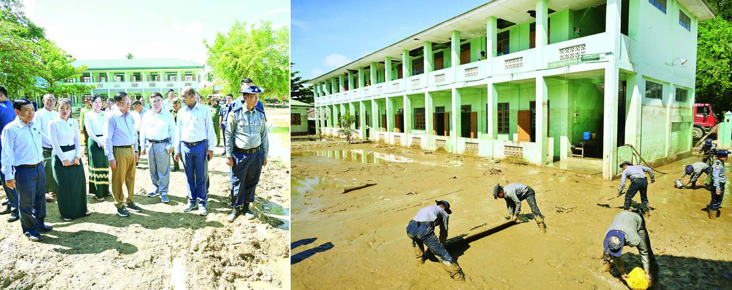 ထို့နောက် နိုင်ငံတော်စီမံအုပ်ချုပ်ရေးကောင်စီဥက္ကဋ္ဌ နိုင်ငံတော်ဝန်ကြီးချုပ်နှင့် အဖွဲ့ဝင်များသည် ရေကြီးရေလျှံမှုများကြောင့် ထိခိုက်ပျက်စီးခဲ့ရပြီး ရေများပြန်လည်ကျဆင်းသွားသည့်အချိန်တွင် နုန်းတင်ကျန်ခဲ့သည့် ဆင်သေကျေးရွာ အခြေခံပညာအထက်တန်းကျောင်း (ခွဲ) ၌ နုန်းများ ဖယ်ရှားရှင်းလင်းခြင်းနှင့် သန့်ရှင်းရေးလုပ်ငန်းဆောင်ရွက်နေမှုများကို သွားရောက်ကြည့်ရှုစစ်ဆေးရာ ကျောင်းတာဝန်ခံ ဆရာ၊ ဆရာမများက ရေကြီးရေလျှံမှုဖြစ်ပေါ်ခဲ့သည့်အခြေအနေများနှင့် သန့်ရှင်းရေးလုပ်ငန်းဆောင်ရွက်နေမှုတို့ကို ရှင်းလင်းတင်ပြကြသည်။ ရှင်းလင်းတင်ပြမှုများအပေါ် နိုင်ငံတော်စီမံအုပ်ချုပ်ရေးကောင်စီဥက္ကဋ္ဌ နိုင်ငံတော်ဝန်ကြီးချုပ်က ကျောင်းပြန်လည်ဖွင့်လှစ်သင်ကြားပေးနိုင်ရေးအတွက် လိုအပ်သည်များကို အမြန်ဆုံးဆောင်ရွက်ပေးသွားရန် တာဝန်ရှိသူများကို မှာကြား သည်။