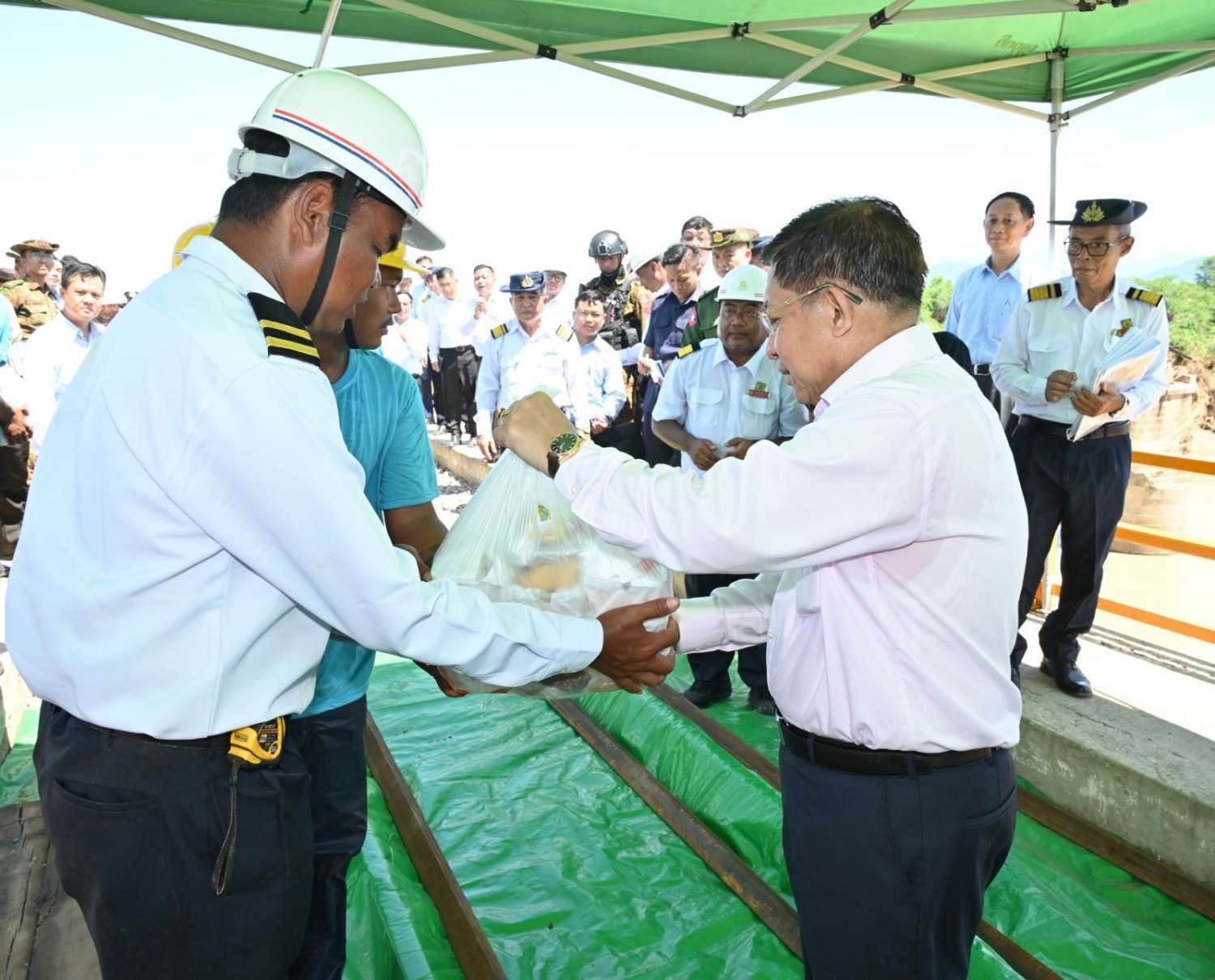 ထို့နောက် နိုင်ငံတော်စီမံအုပ်ချုပ်ရေးကောင်စီဥက္ကဋ္ဌ နိုင်ငံတော်ဝန်ကြီးချုပ်သည် တံတားအမှတ် ၆၉၁(အစုန်)၏ သံဘောင် ၄ ခုပြုတ်ကျခဲ့ပြီး တိုင်အမှတ် ၃ ရေစီးအားဖြင့် မျောပါပျက်စီးခဲ့မှုအား Triple Double Bailey တံတား(၉၀) ပေ ထိုးခြင်းလုပ်ငန်းဆောင်ရွက်နေမှုများကို ကြည့်ရှုစစ်ဆေးပြီး မီးရထားလမ်းပြုပြင်နေသည့် ဝန်ထမ်းများအတွက် စားသောက်ဖွယ်ရာများ ချီးမြှင့်ပေးအပ်သည်။