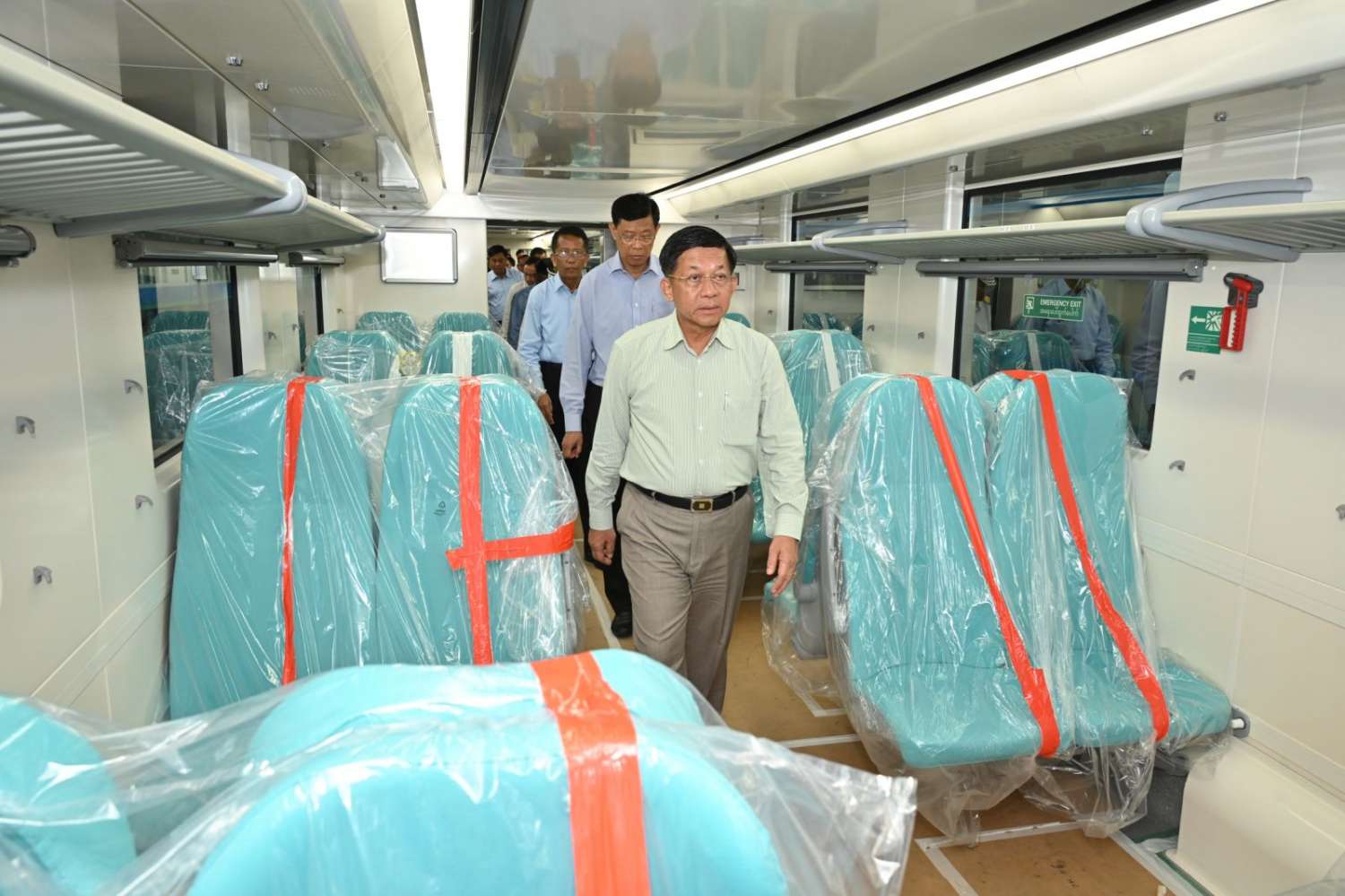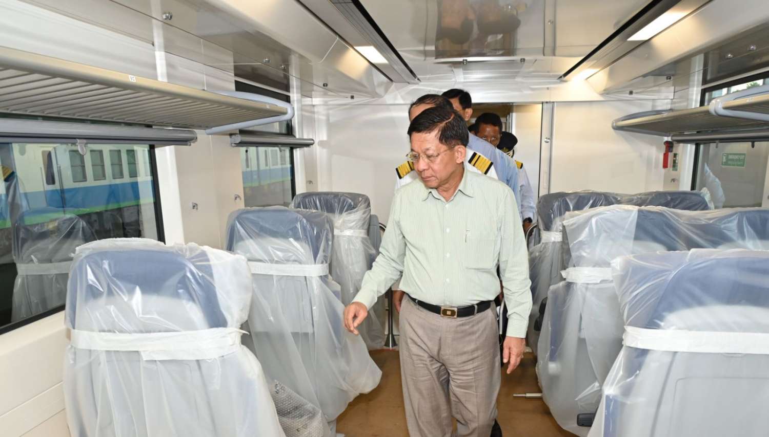 ထို့နောက် နိုင်ငံတော်စီမံအုပ်ချုပ်ရေးကောင်စီဥက္ကဋ္ဌ နိုင်ငံတော်ဝန်ကြီးချုပ်နှင့် အဖွဲ့ဝင်များသည် စပိန်နိုင်ငံမှရောက်ရှိလာသည့် DEMU ရထားတွဲဆိုင်းအသစ်များအား ကြည့်ရှုစစ်ဆေးကာ တာဝန်ရှိသူများ၏ ရှင်းလင်းတင်ပြမှုများအပေါ် လိုအပ်သည်များမှာကြားခဲ့ကြောင်း သတင်းရရှိသည်။