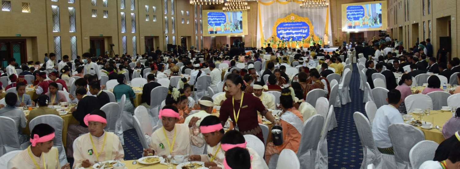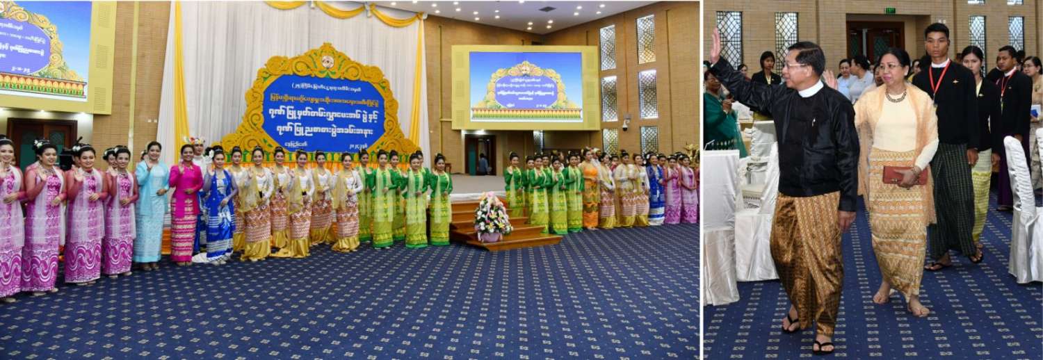 ဦးစွာ နိုင်ငံတော်စီမံအုပ်ချုပ်ရေးကောင်စီဥက္ကဋ္ဌ နိုင်ငံတော်ဝန်ကြီးချုပ်နှင့် ဇနီးနှင့် အခမ်းအနားတက်ရောက်လာကြသူများအား တိုင်းရင်းသားရိုးရာအကအဖွဲ့များက ရိုးရာယဉ်ကျေးမှု အကအလှများဖြင့် ကြိုဆိုကြသည်။